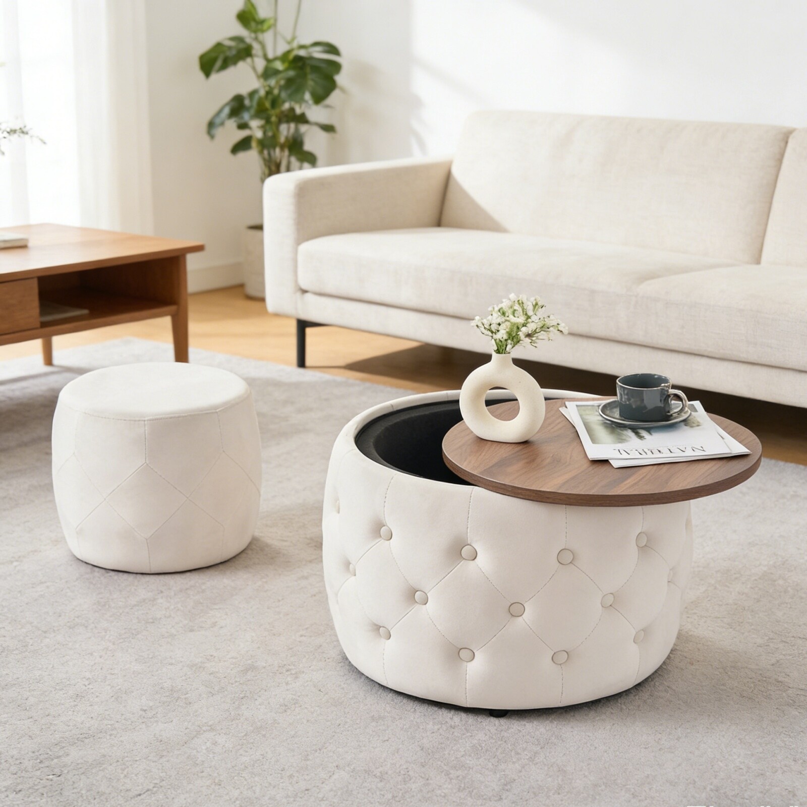 22.75" Velvet Nesting Round Storage Ottoman, End Table and Footstool