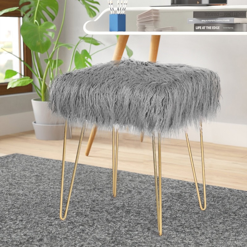 Adeco Faux Ottoman Vanity Stool with Metal Legs for Bedroom