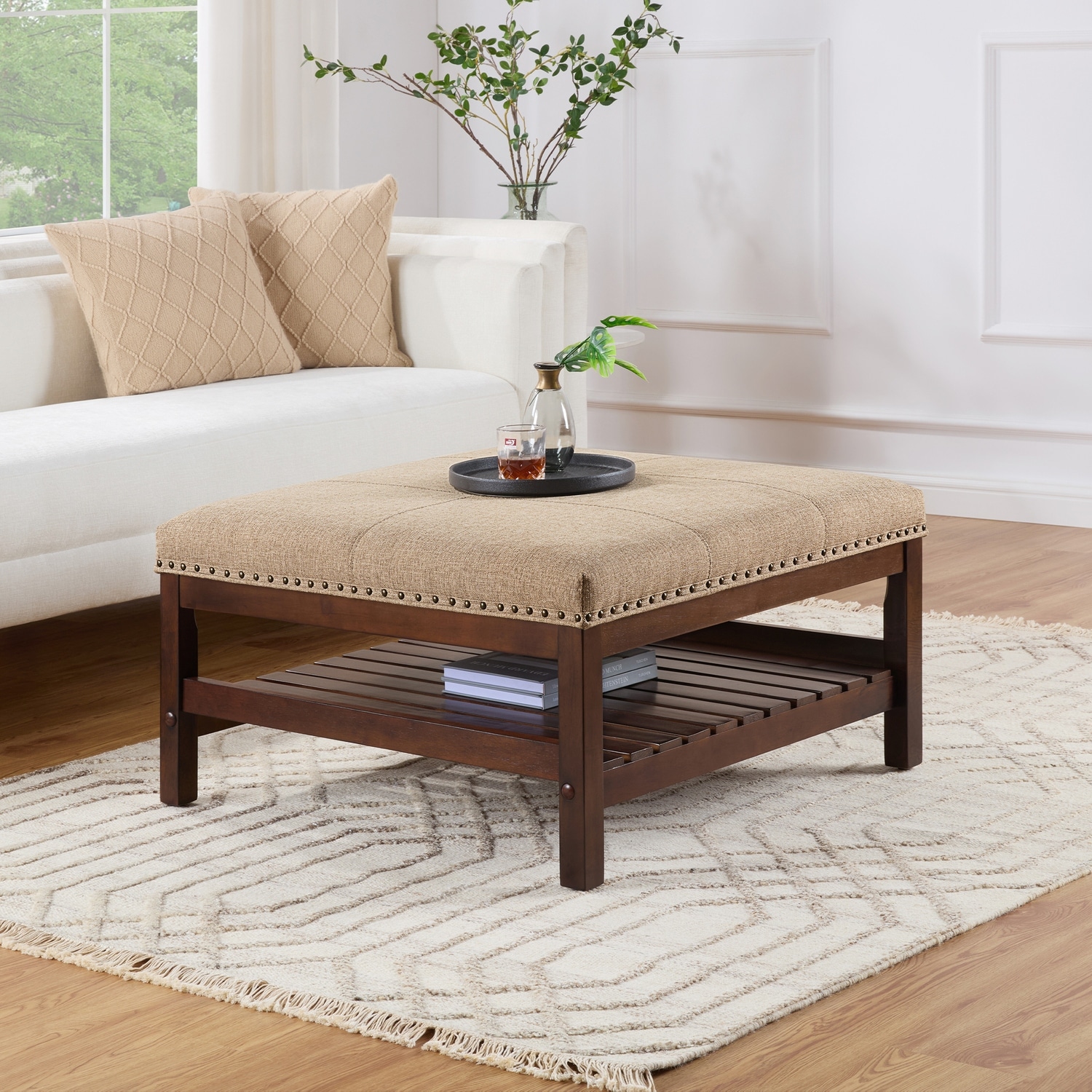 Coffee Table Cocktail Ottoman with Storage Shelf - Stylish Living Room Center Table with Upholstered Top and Storage Shelf