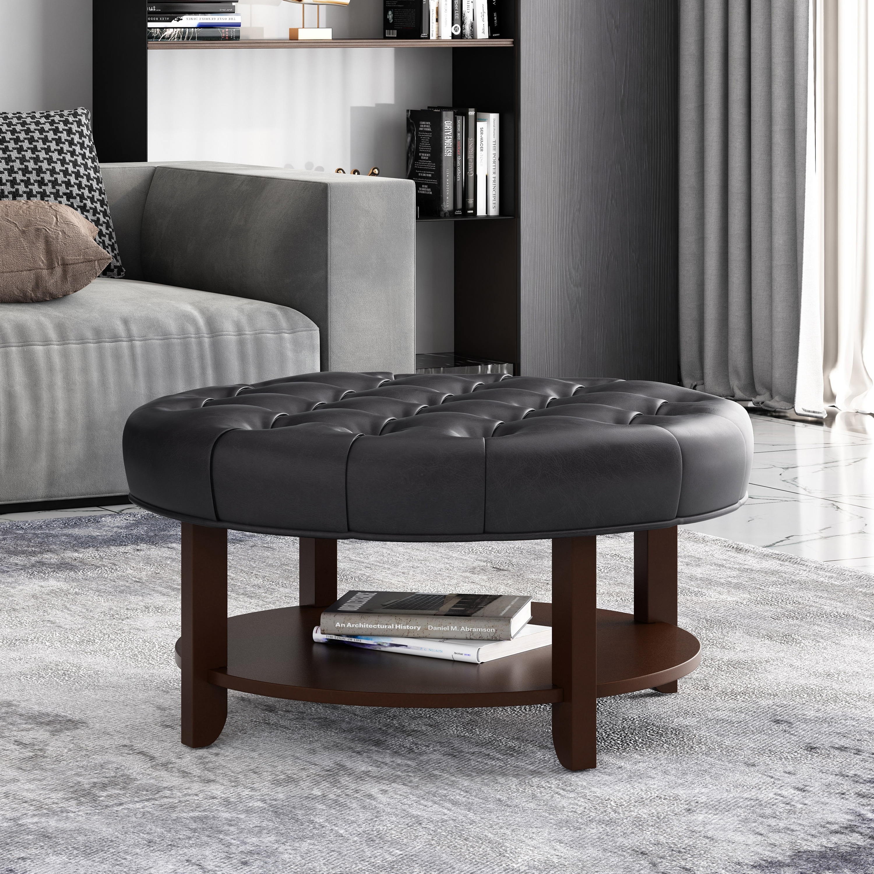 Roomfitters Round Faux Leather Ottoman Coffee Table, Tufted Upholstered Top with Wooden Storage Shelf