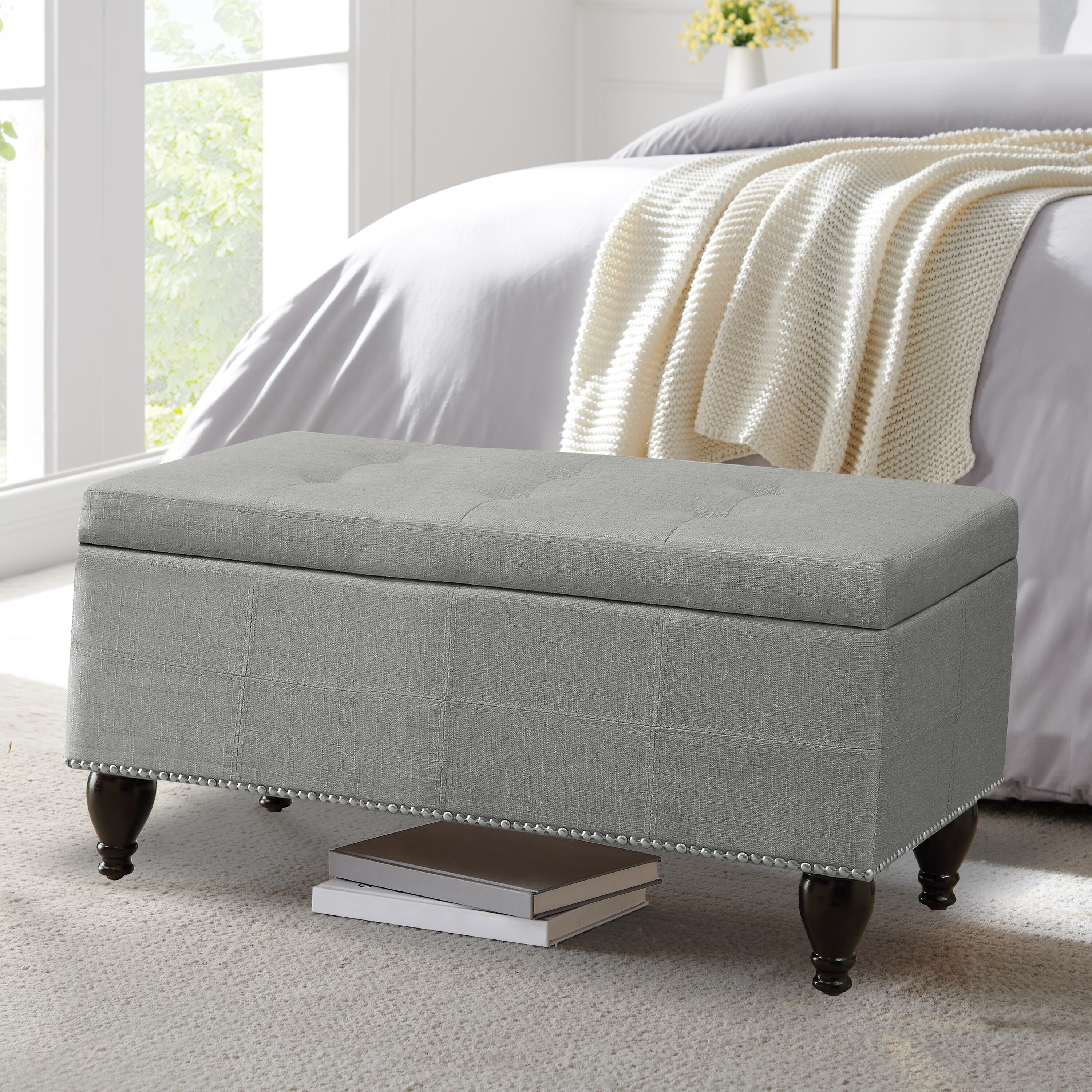 Button-Tufted Storage Ottoman with Flip-Top Seat and Linen-Texture Cushion Wood Frame