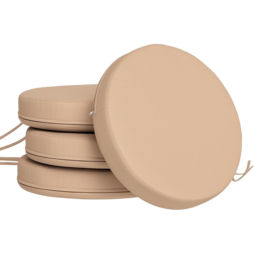 Set of 4 Round Outdoor Chair Cushions with Washable Covers, 15x15x3 Inches, Non-Slip Ties, Khaki