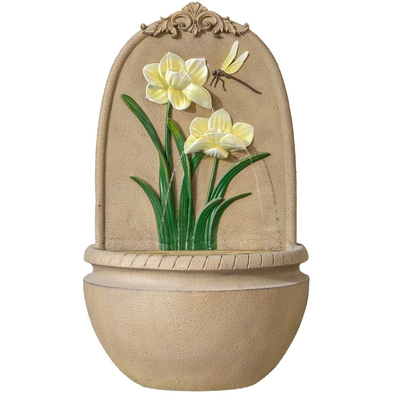XBrand 31" in H Outdoor Wall Water Fountain with Pump - Khaki, Pink, and Yellow Flower with Dragonfly Design with Mesh guard