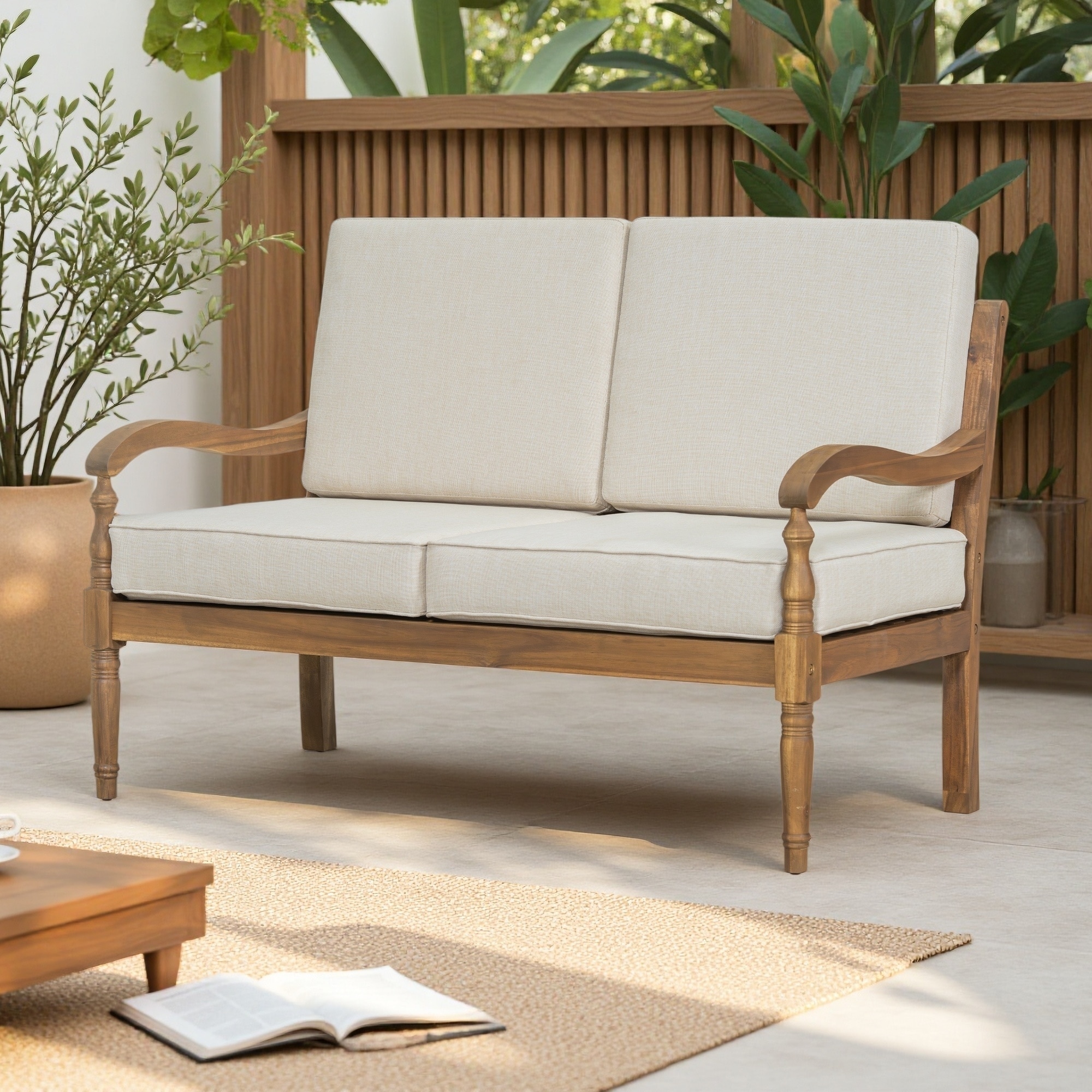 Outdoor Acacia Wood Loveseat with Comfortable Cushions and Curved Armrests