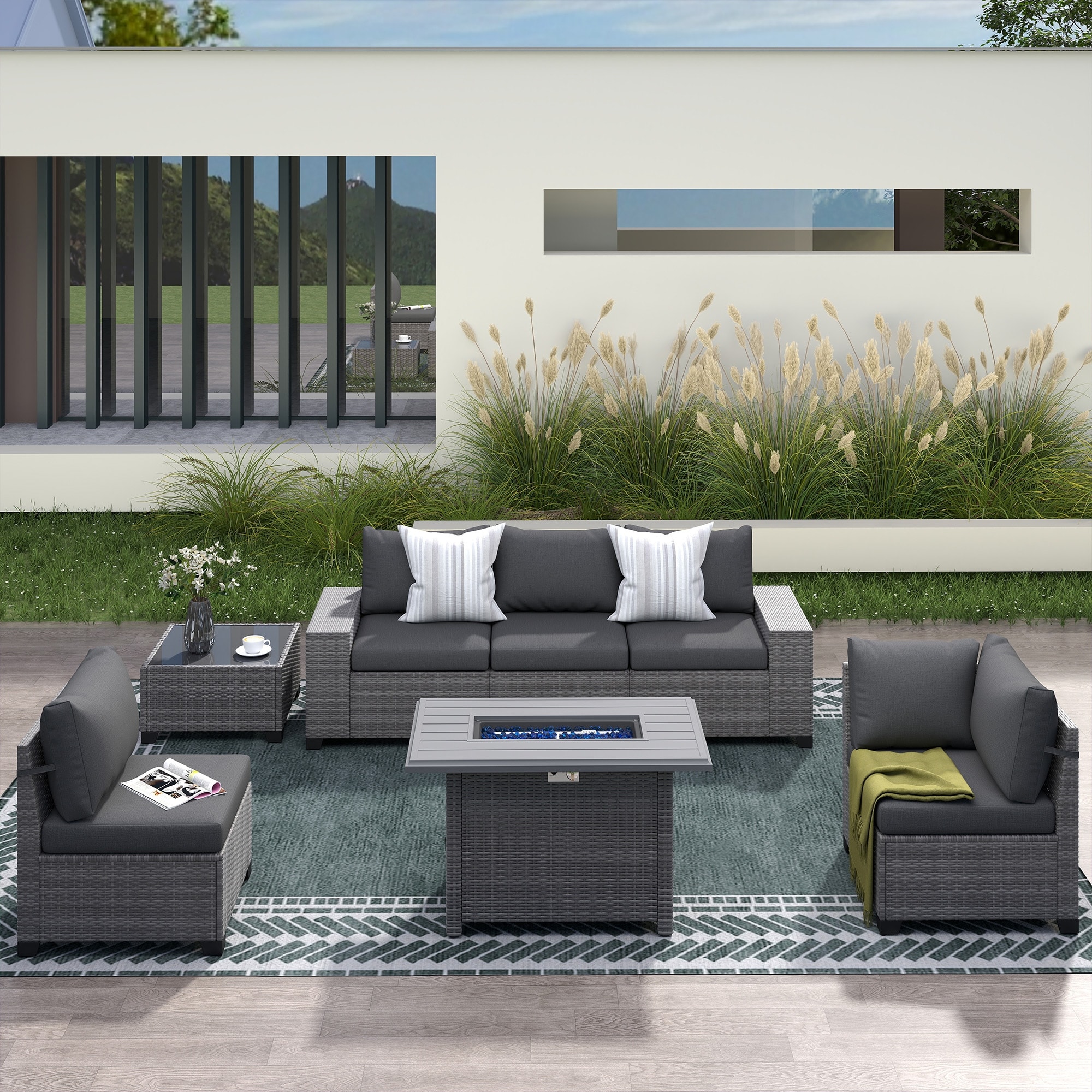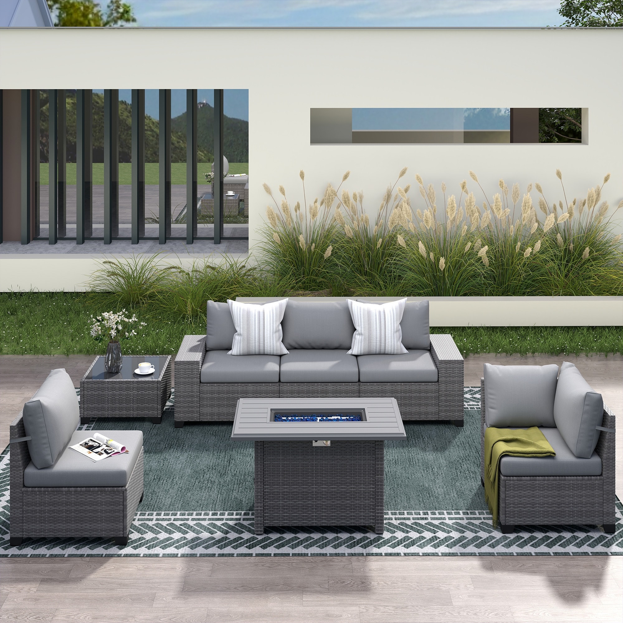 Modern 6-piece Outdoor Iron Rattan Conversation Sofa Set with Aluminum Fire Pit Table