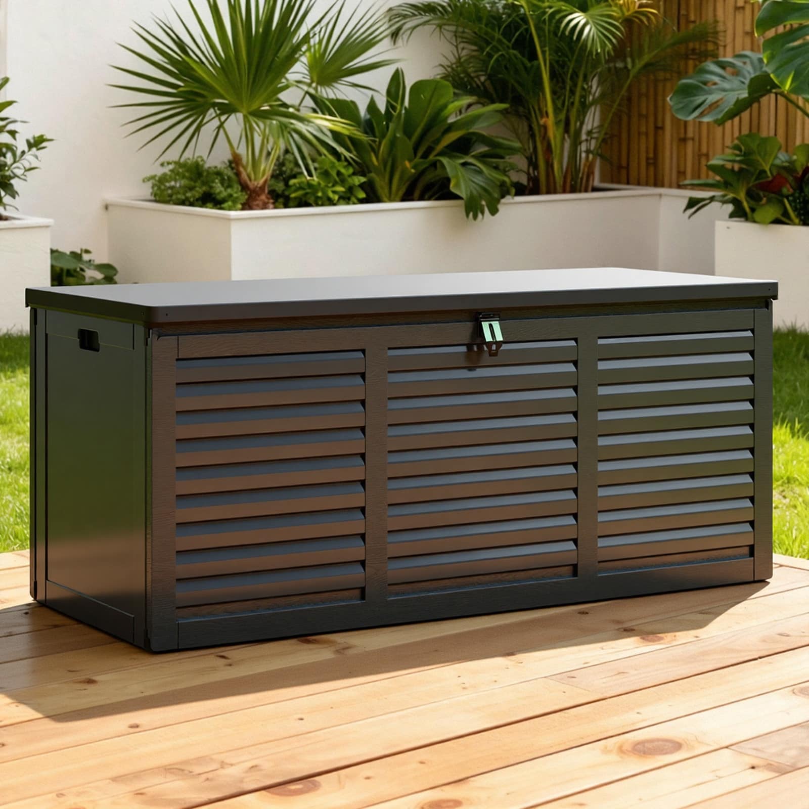 Large Mix Brown Deck Storage Box with Steel Frame and Wheels and Protective Liner