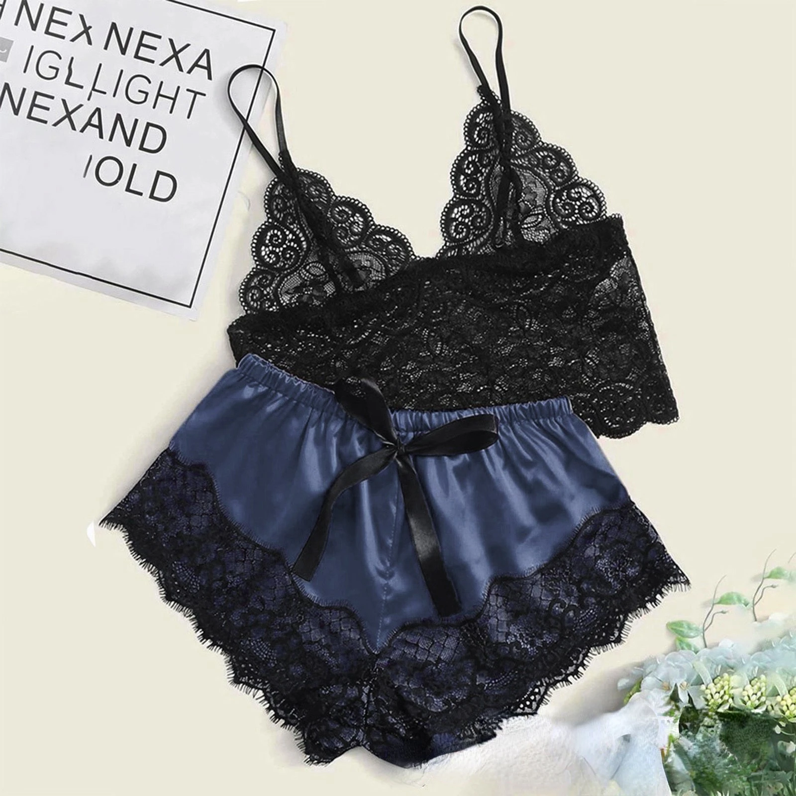 Lace Pajama Set, Sexy Sleepwear For Women, Top Shorts Lingerie, Comfortable Underwear Pajama Set black xl