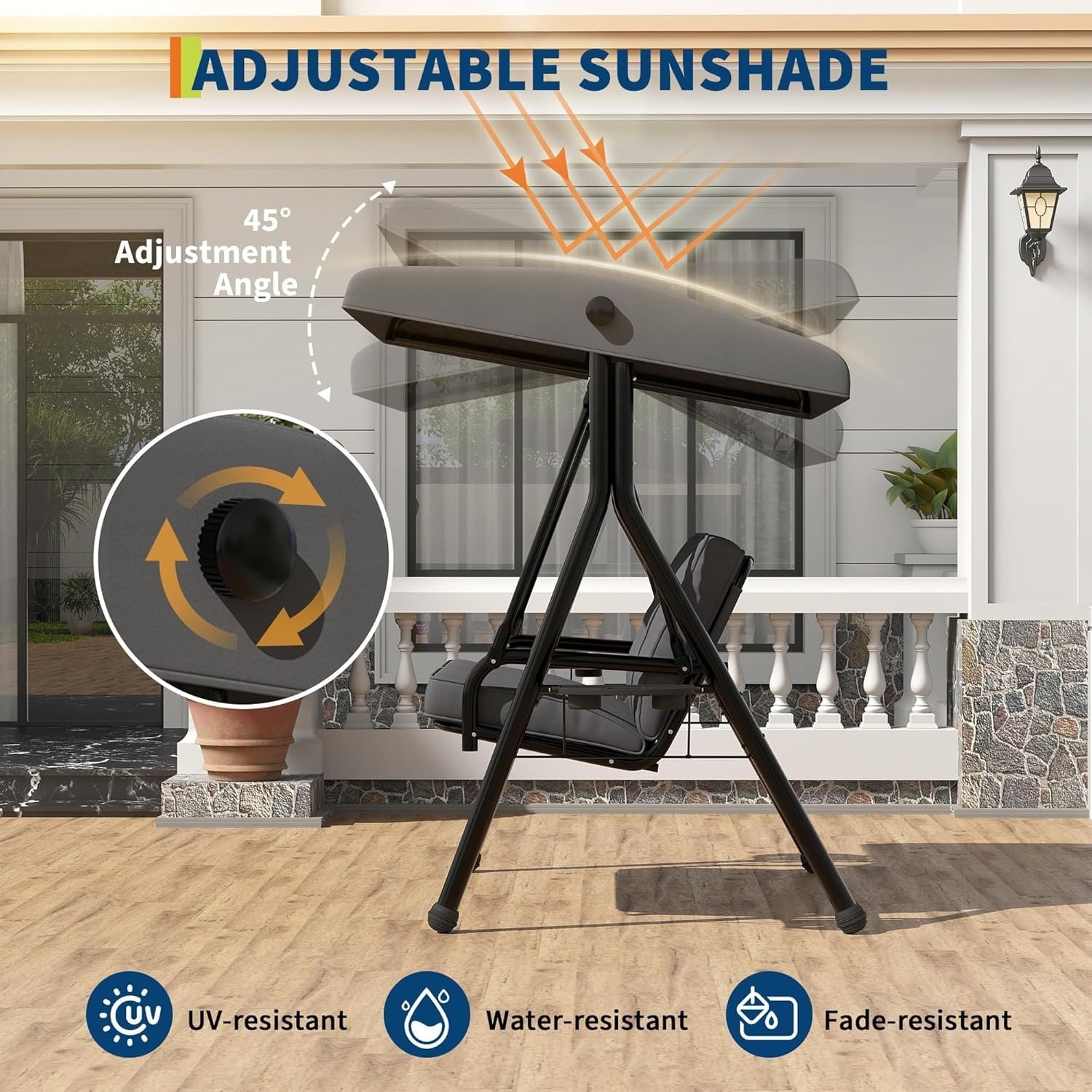2-Seater Outdoor Swing Chair with Canopy, Cushioned Patio Bench with Metal Frame