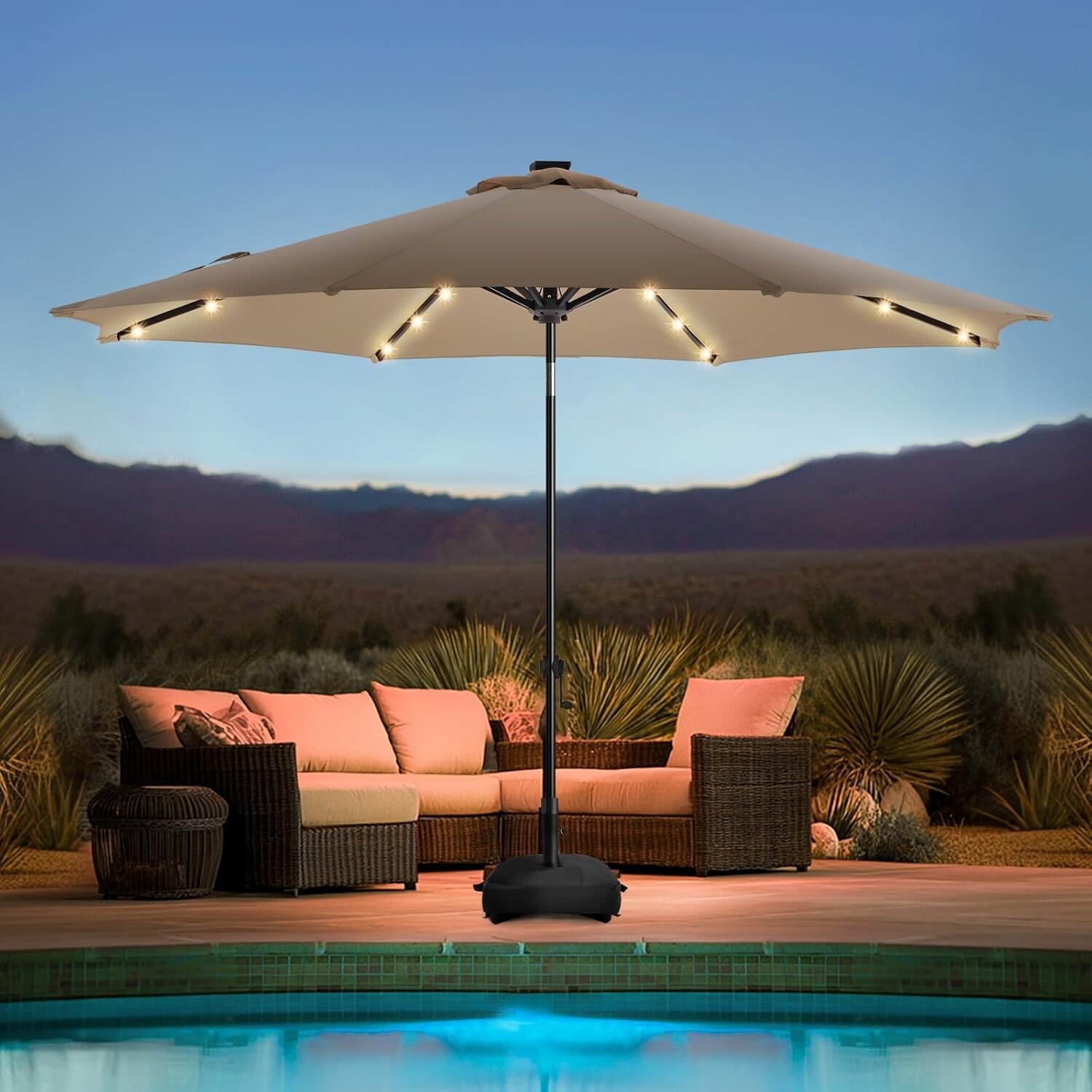 11FT Solar LED Patio Umbrella with Base, Tilt, Crank, 32 LED Lights, Tan