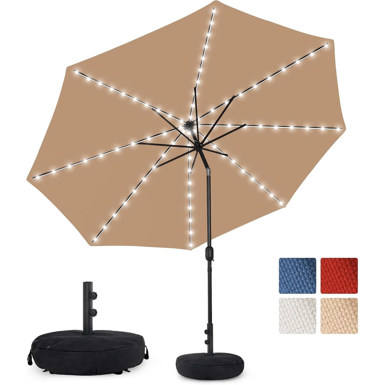 5-Year Fade-Resistant Solar LED Patio Umbrella with Sand Bag Base, Tilt and Crank, Tan