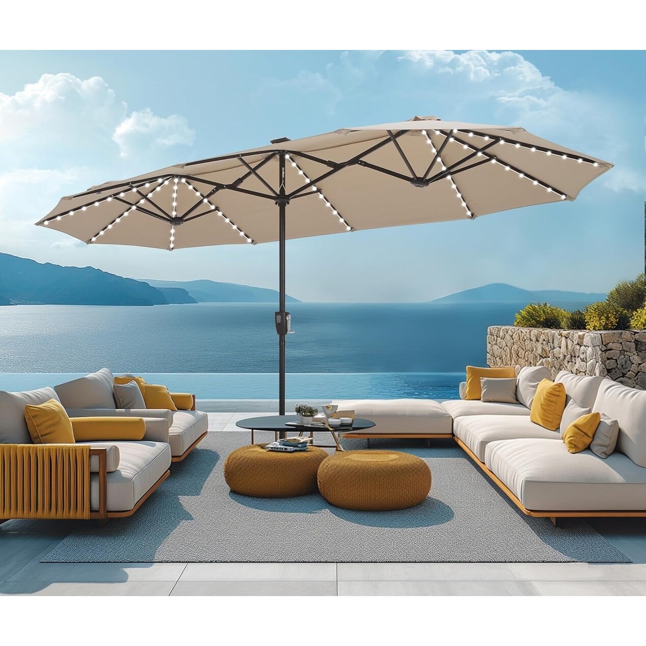13ft Double-Sided Outdoor Rectangular Umbrella with Solar LED Lights, Hand Crank, Beige