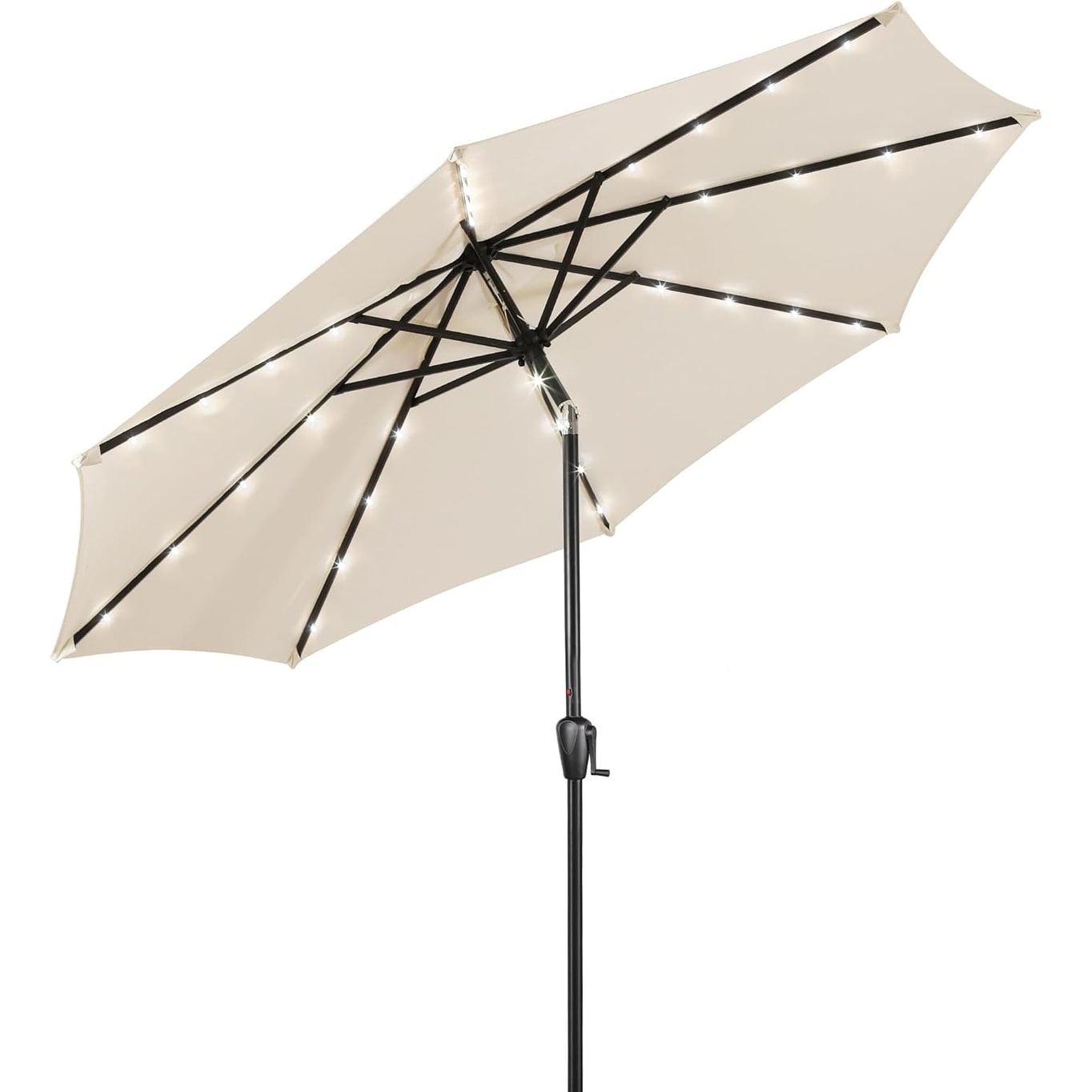 9' Round Solar-Powered LED Patio Umbrella with Push-Button Tilt and Hand Crank Lift, Creamy Beige
