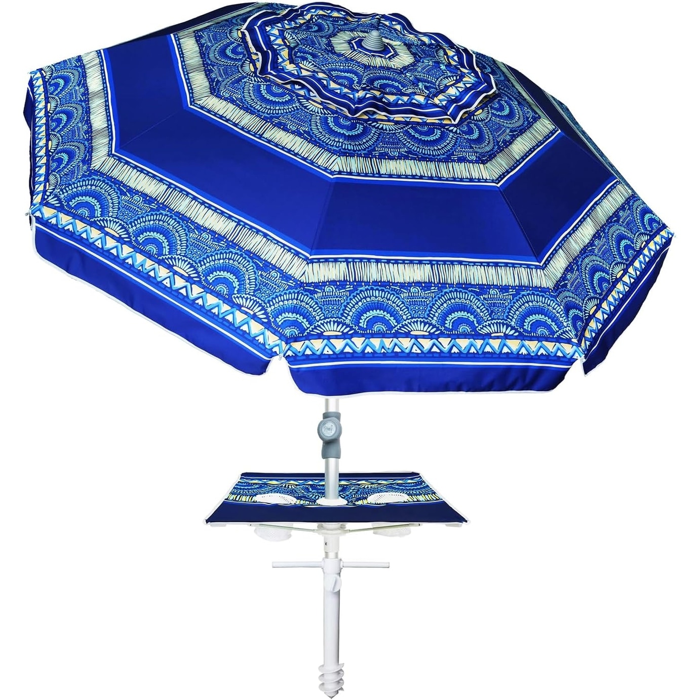 7ft Heavy Duty Windproof Beach Umbrella with Tilt Pole, Built-in Table, Sand Anchor, and UPF 50+ UV Protection
