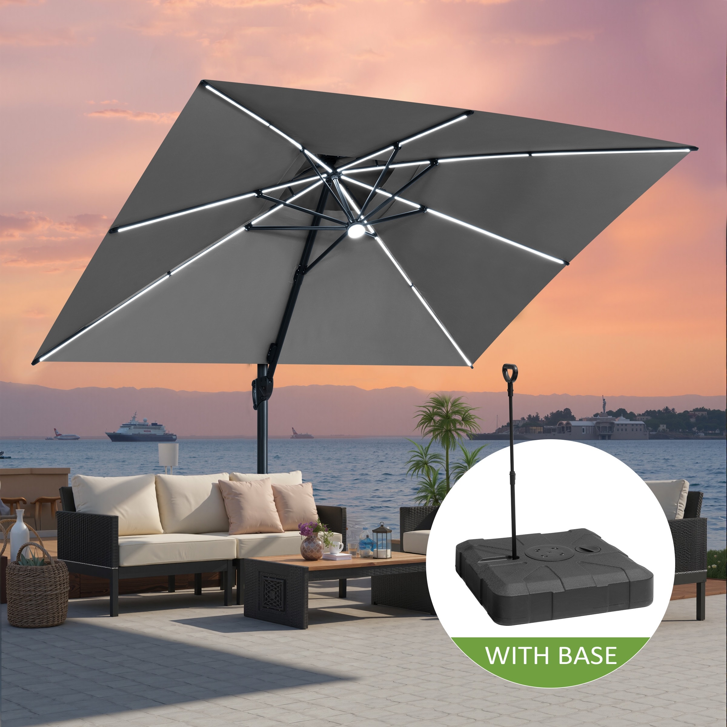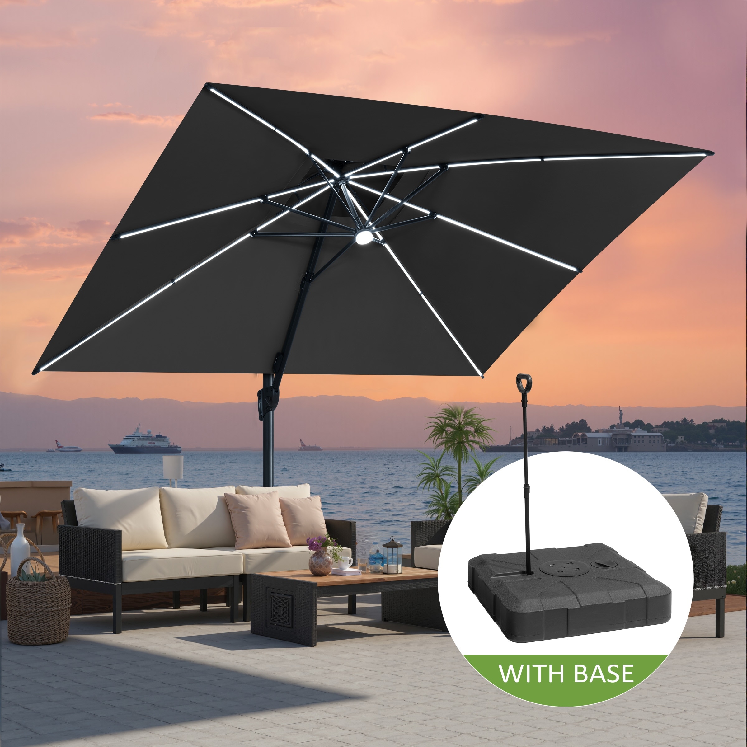 Pellebant 11X11 FT Outdoor Square Cantilever Patio Umbrella Solar LED Lighted with HDPE Base