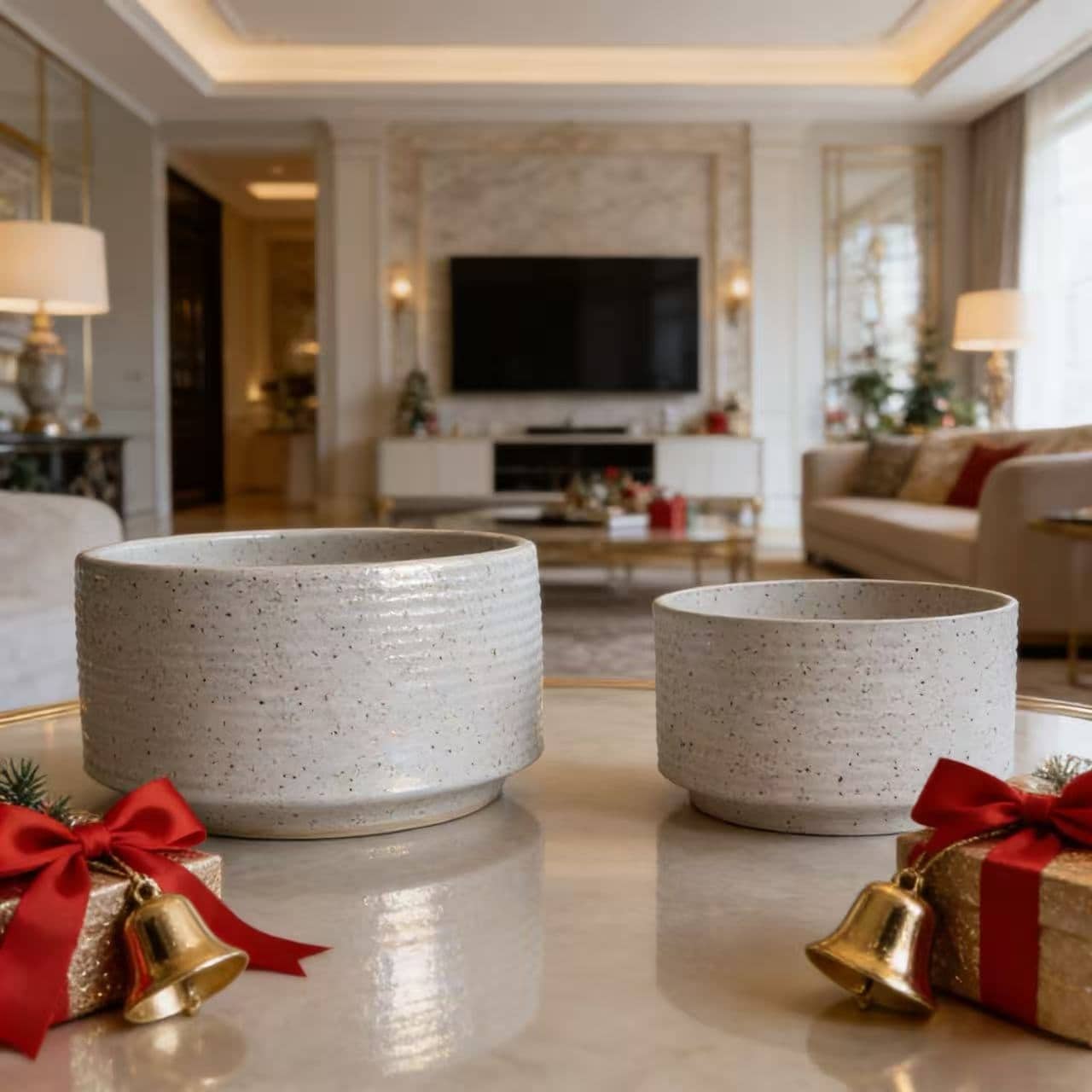 Handmade Ceramic Planter Set of 2, 11" & 8" Diameter, White with Vertical Ridges
