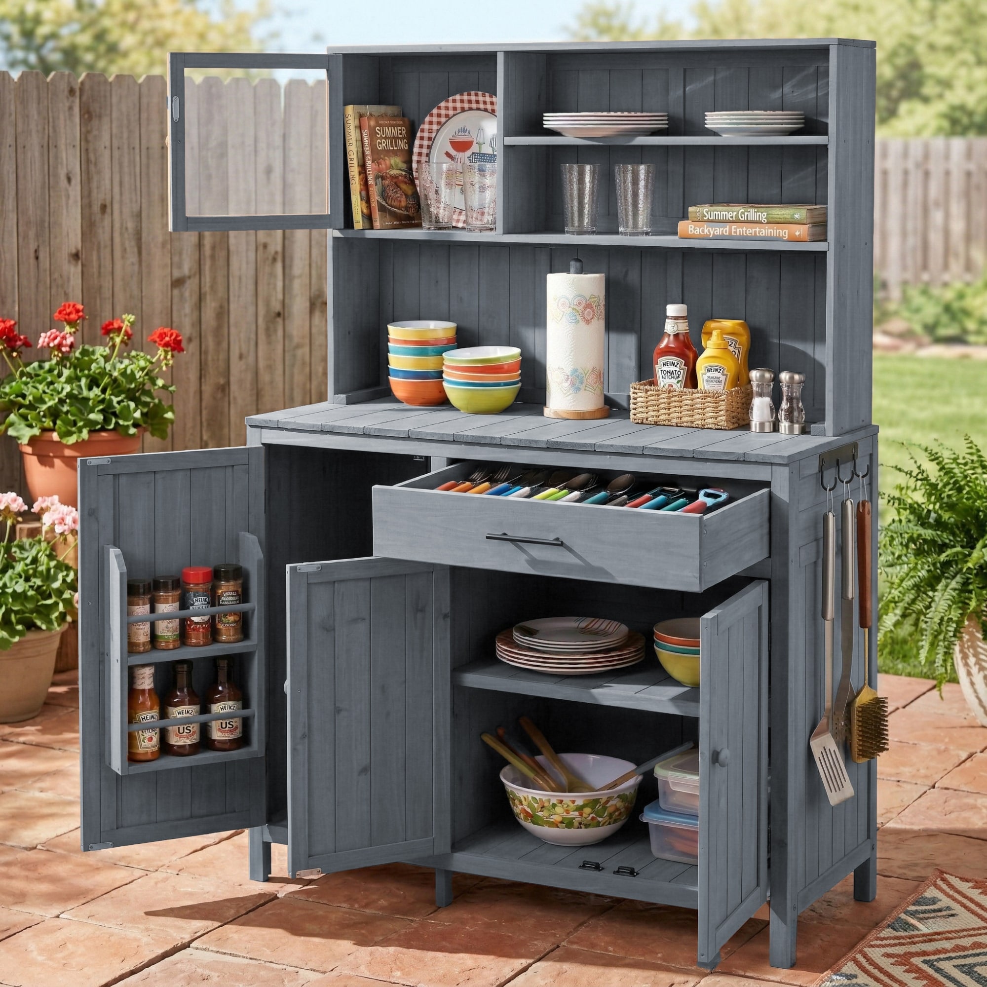 Potting Bench with Hutch, 65"H Solid Fir Wood Garden Workstation,Large Countertop,with Shelves,Spice Rack,Side Hook and Drawer