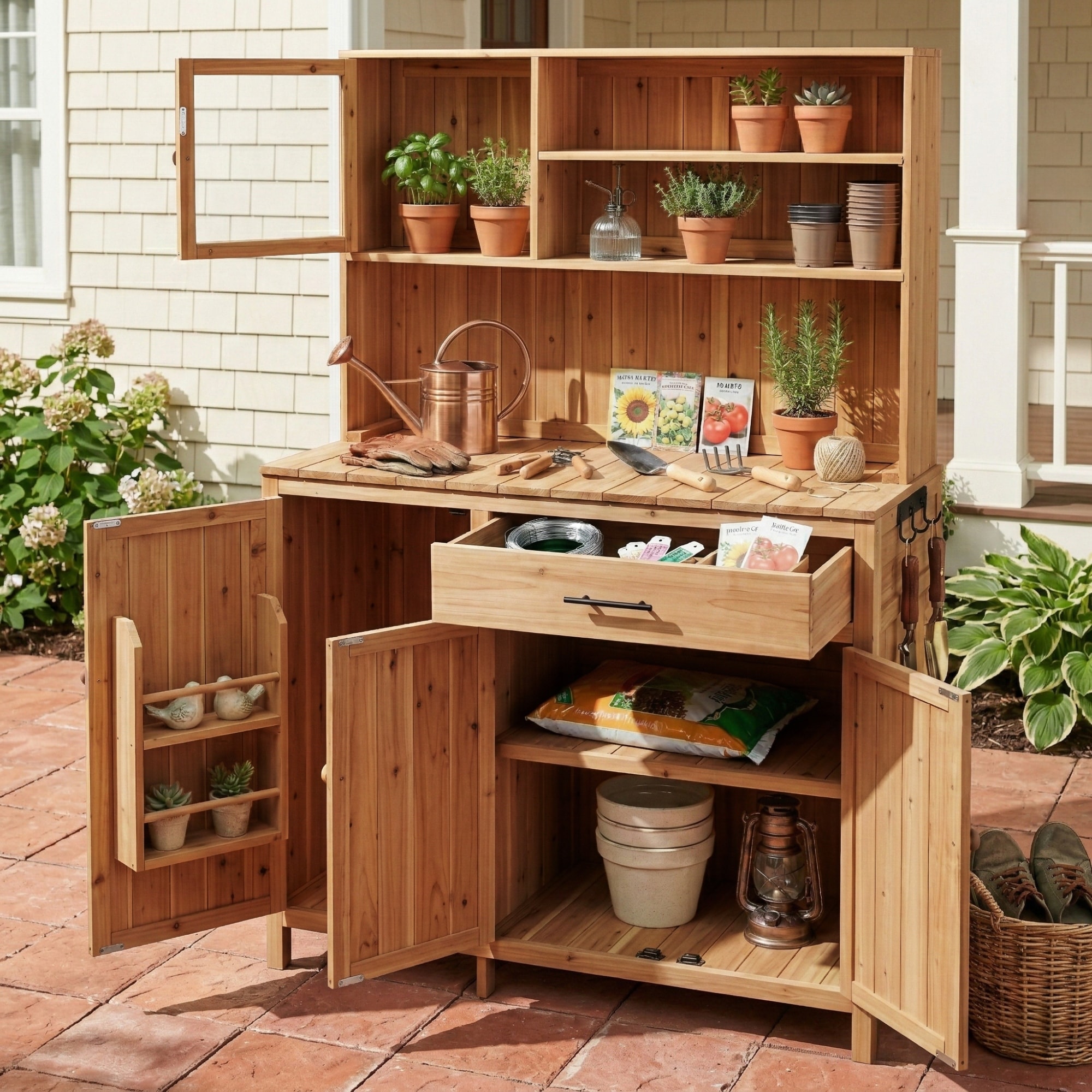 Outdoor Potting Bench Table with Large Space Storage, Fir Wood Workstation with Storage Shelf, Drawer, Cabinet