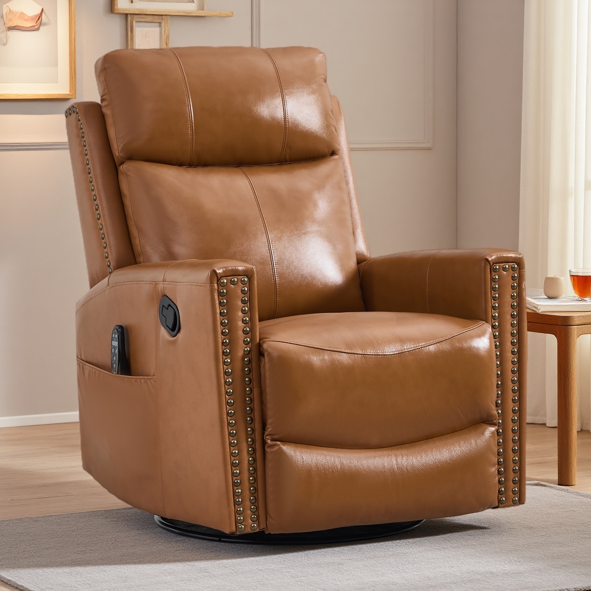 Genuine Leather Manual Recliner Chair with 360° Swivel, Rocking, and Heat Massage for Living Room