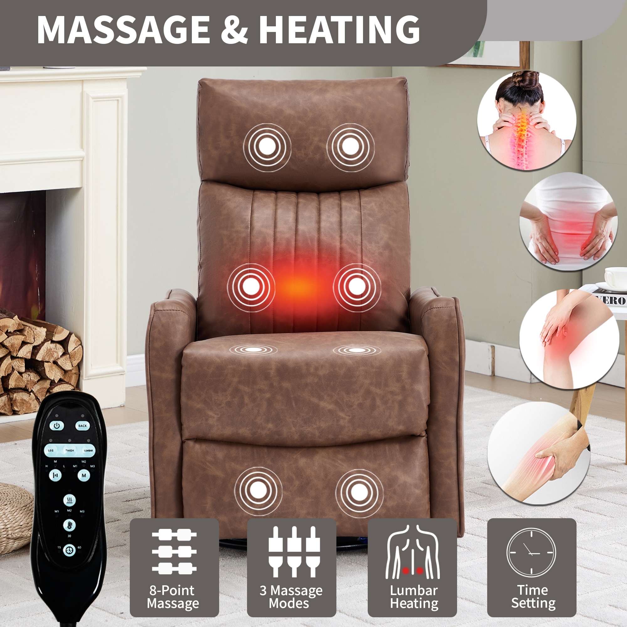 Vintage Upholstered Wingback Heated Massage Recliner Chair with Remote & Push-Back Recline