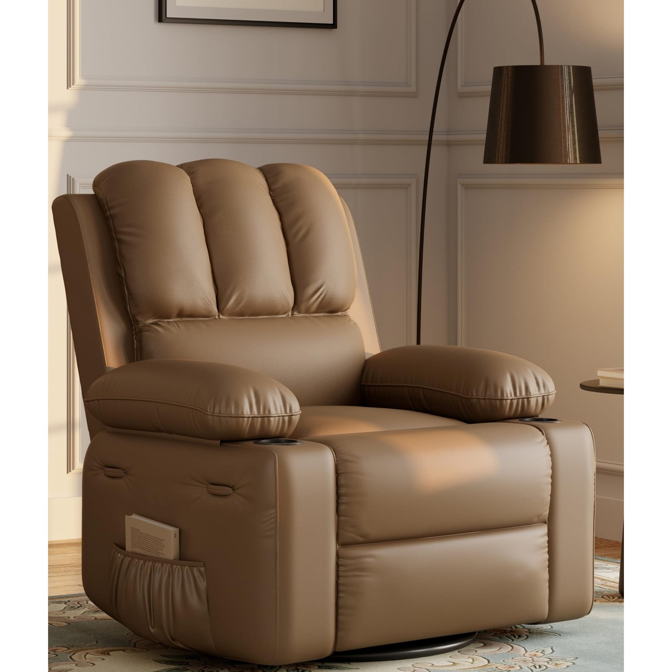 Genuine Leather Manual Rocker Swivel Recliner with Massage and Heat