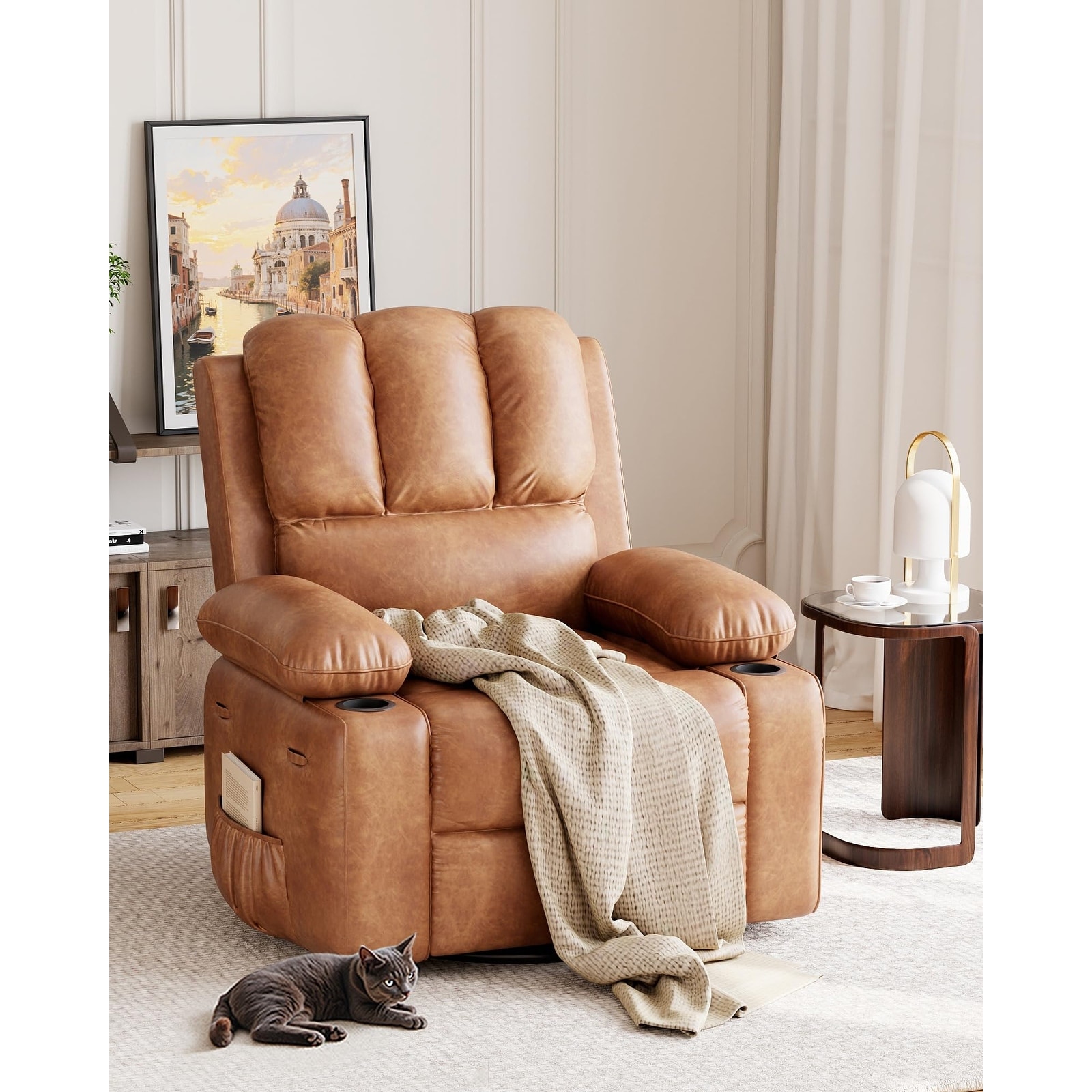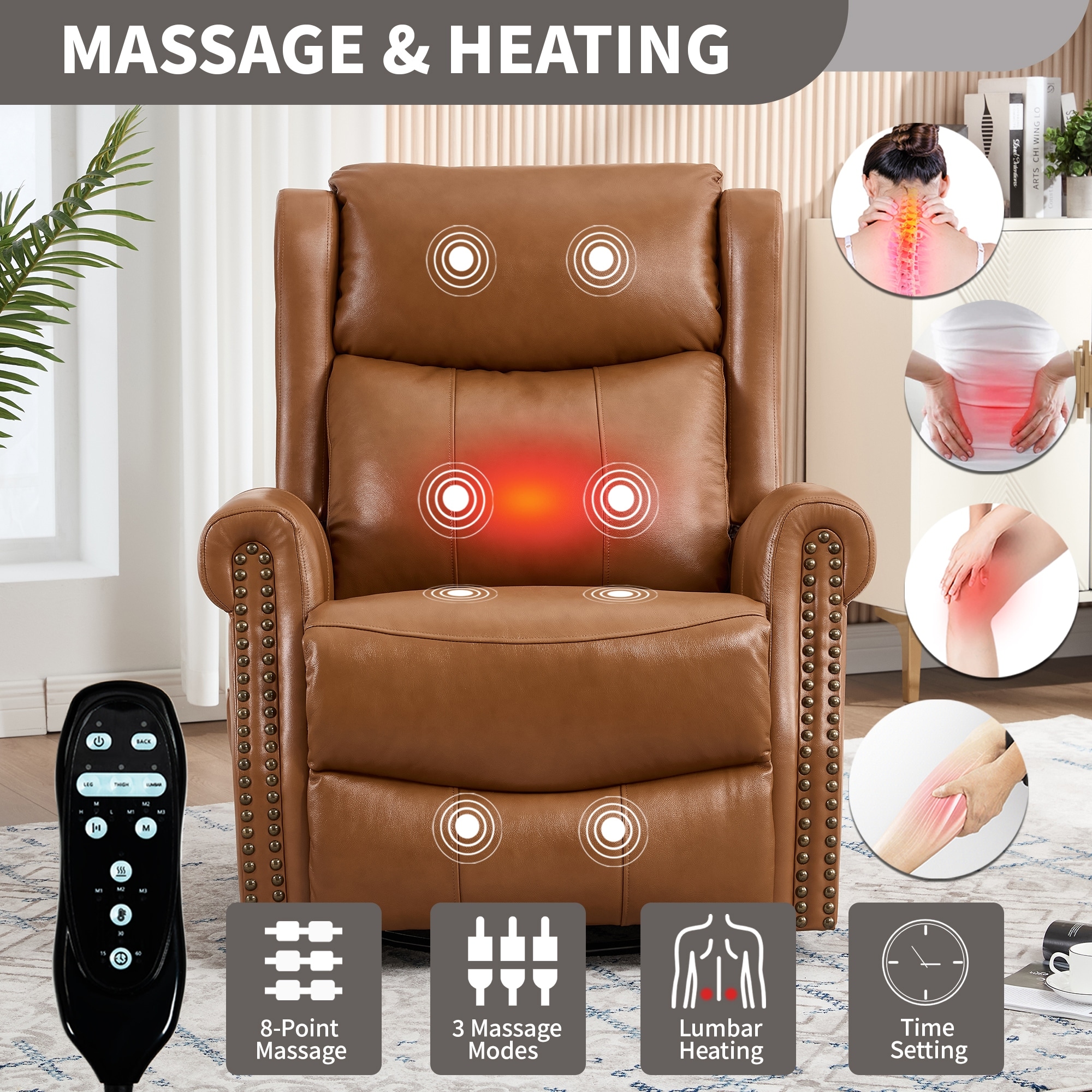 Swivel Sofa Electric Massage Chair with Lumbar Heat Nailhead Accent Leather Manual Recliner Rocking Chairs with Side Pocket