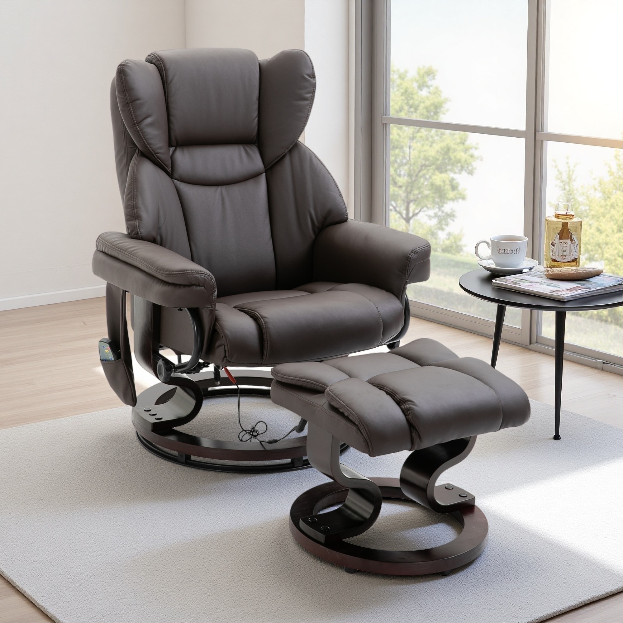 Faux Leather Massage Recliner Chair with Ottoman, 10-Point Vibration & 360° Swivel Wood Base