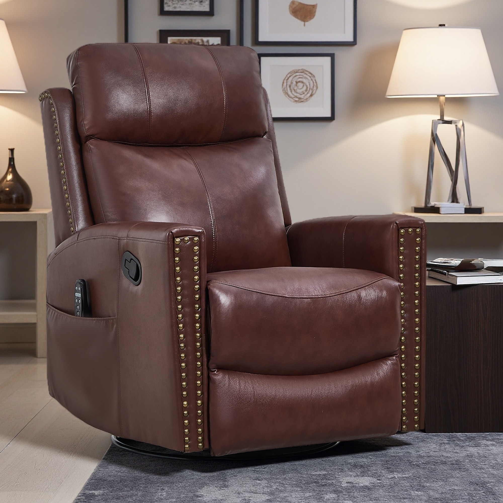 Genuine Leather Manual Recliner Chair with 360° Swivel, Rocking & Heat Massage