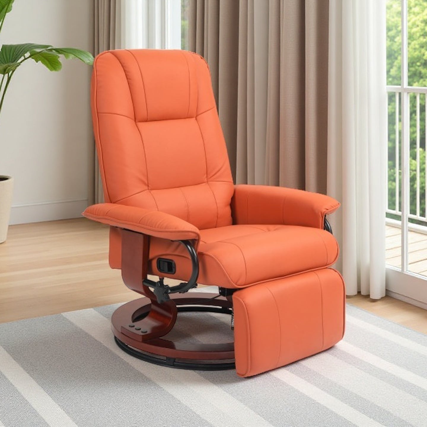 Orange Faux Leather Recliner Chair with Swivel Wooden Base, Manual Adjustable Lounge Armchair with Footrest and Padded Support