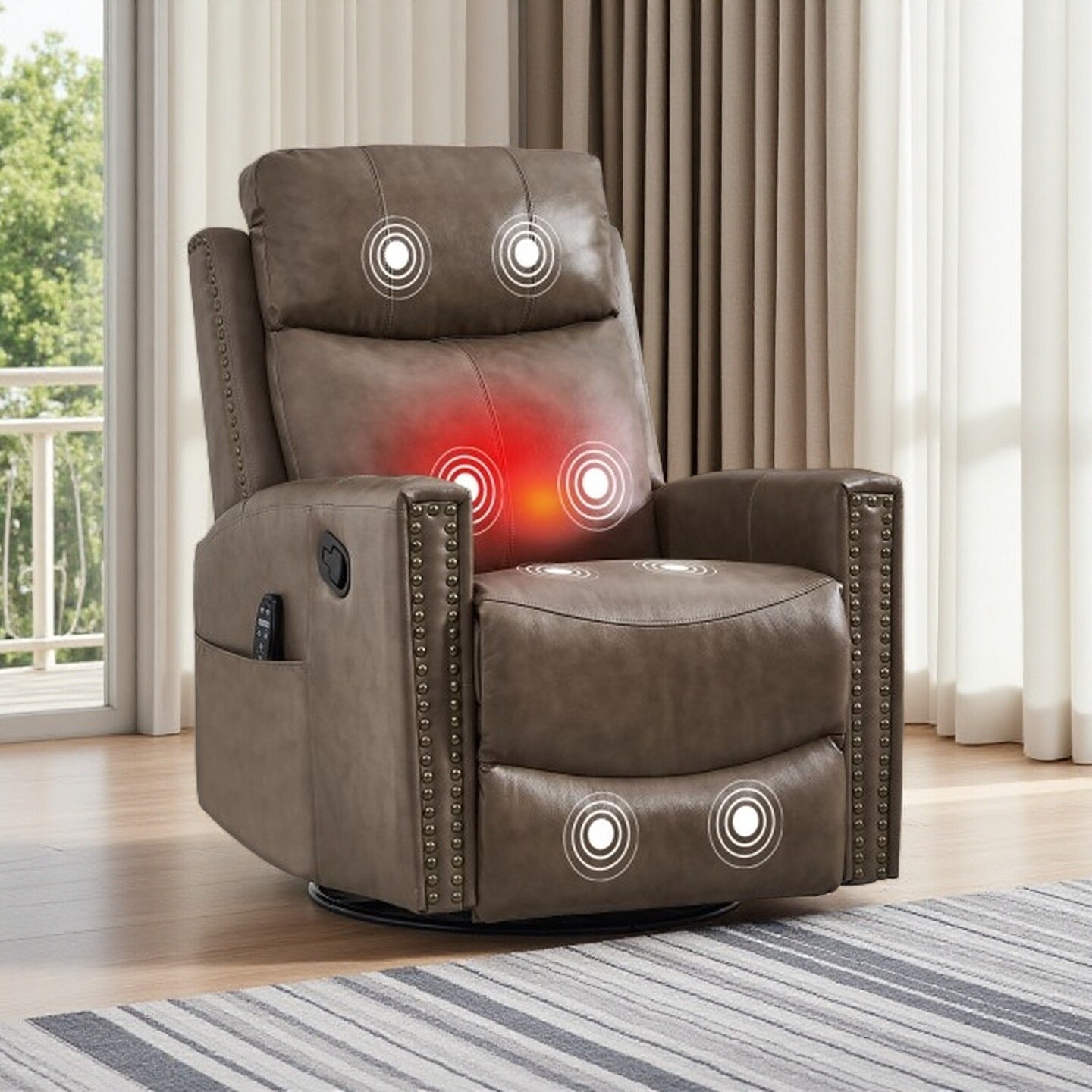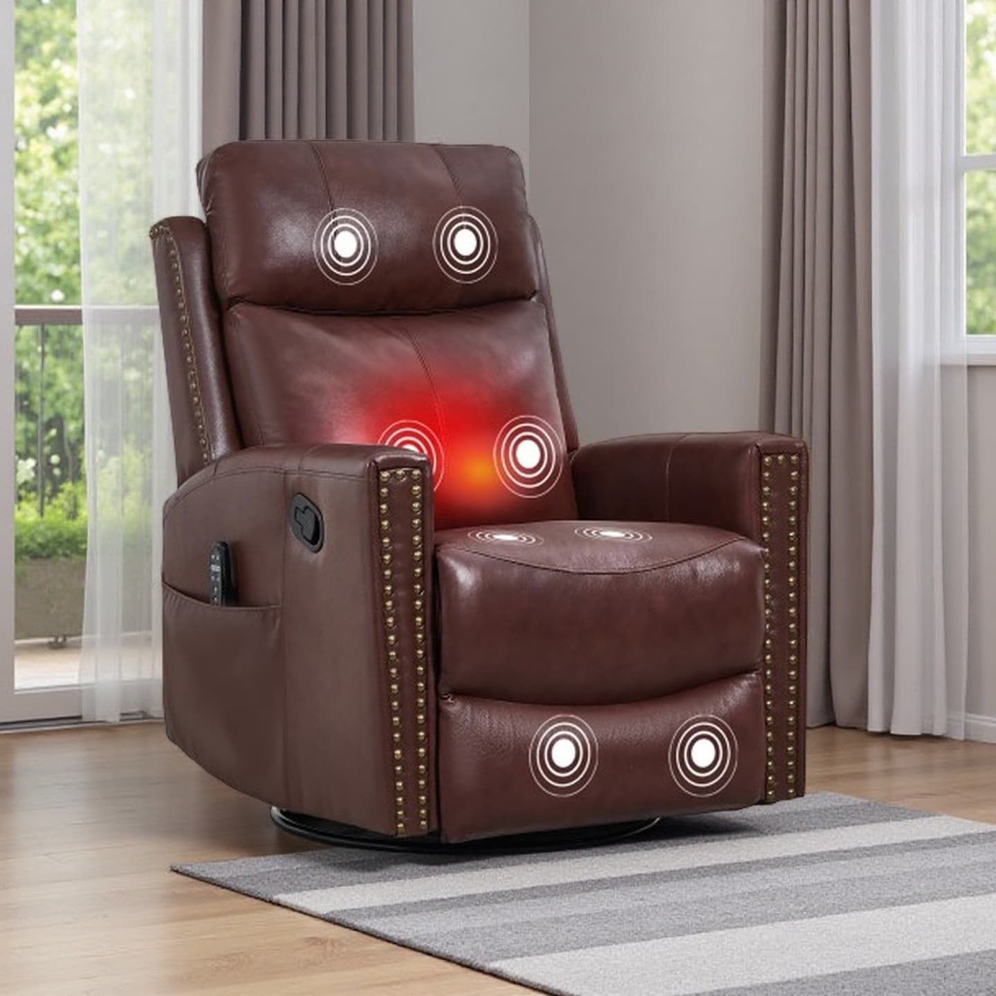 Genuine Leather Swivel and Rocking Recliner Chair with Heat and Massage, 8-Point Vibrating Nodes, Manual Recline up to 155°
