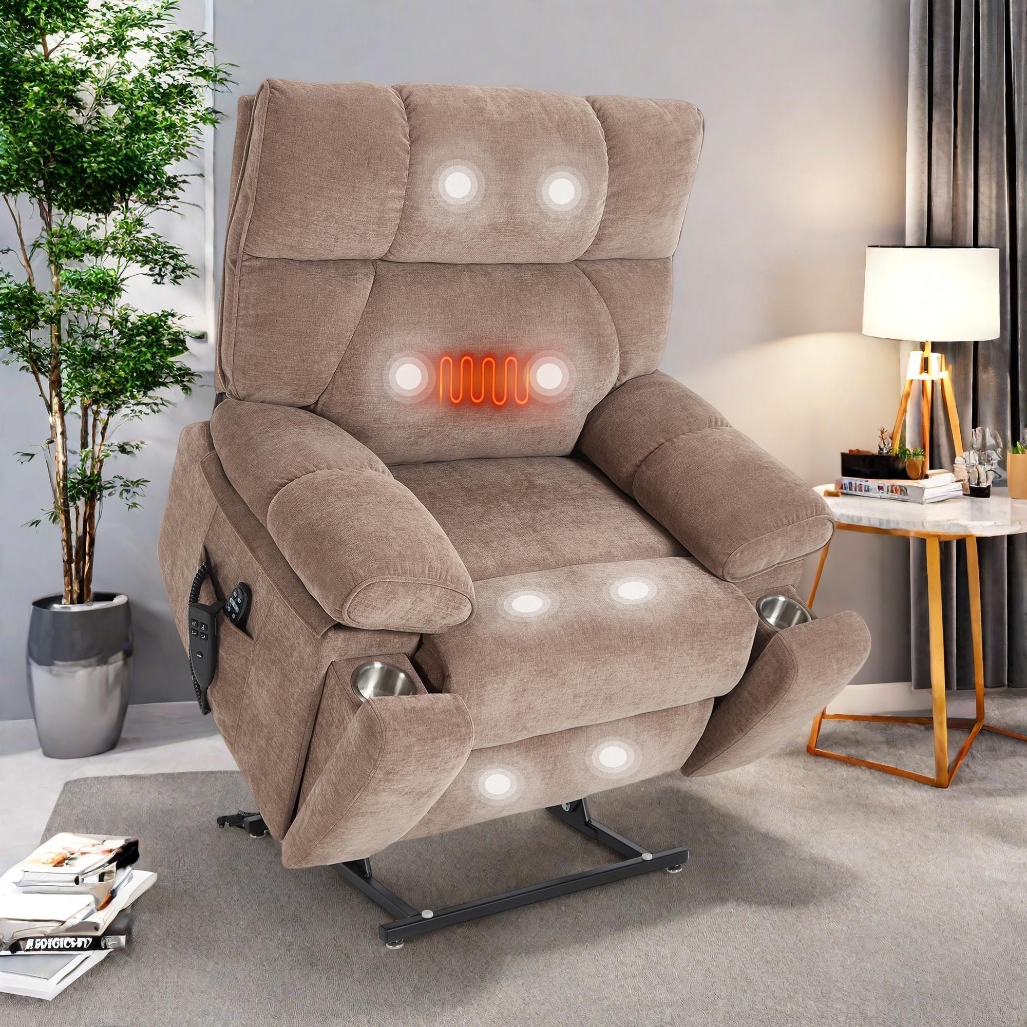Oversized Chenille Power Lift Recliner Chair with Massage and Lumbar Heating, Hidden Cup Holders, Infinite Position