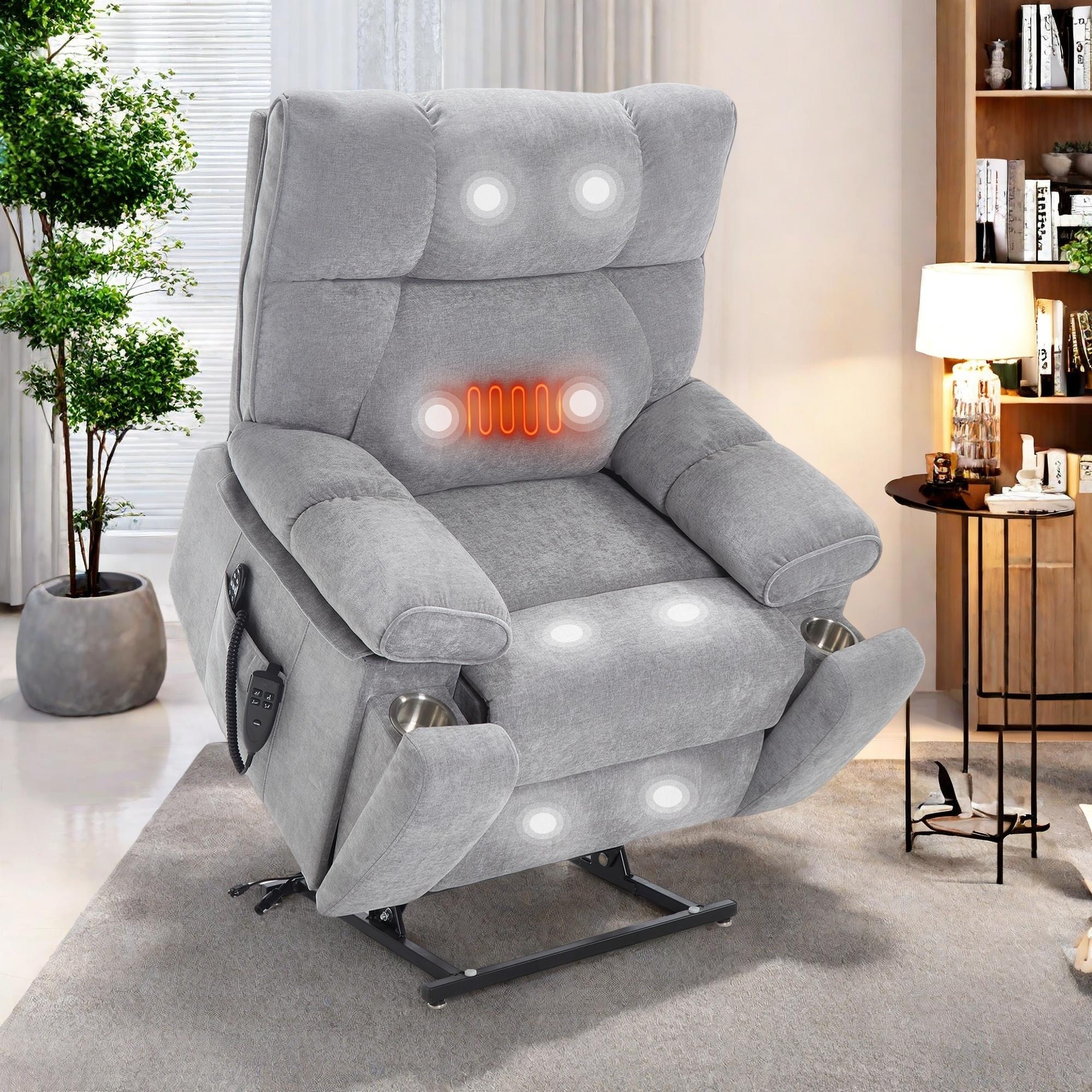 Oversized Chenille Power Lift Recliner Chair with Massage and Lumbar Heating, Hidden Cup Holders, Infinite Position