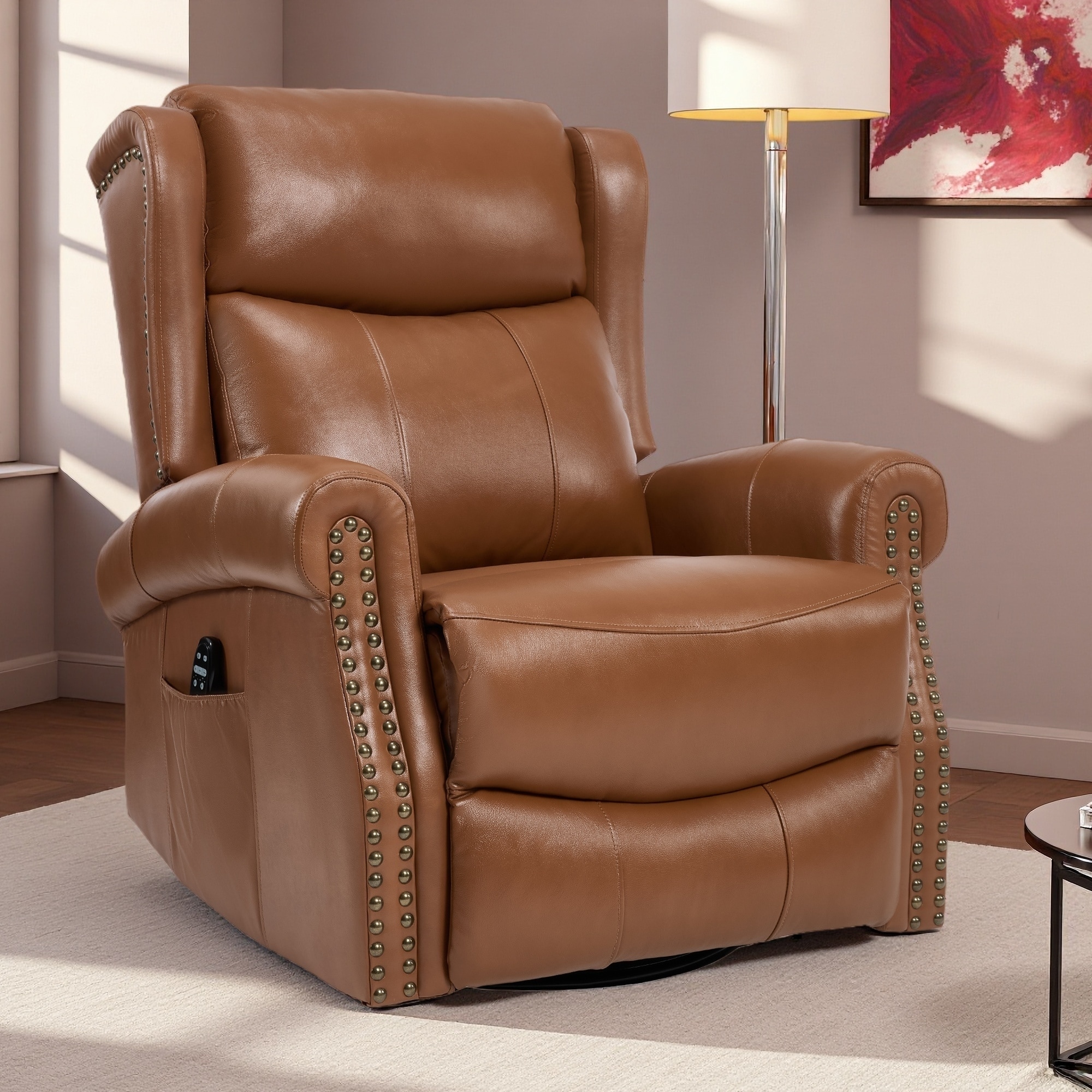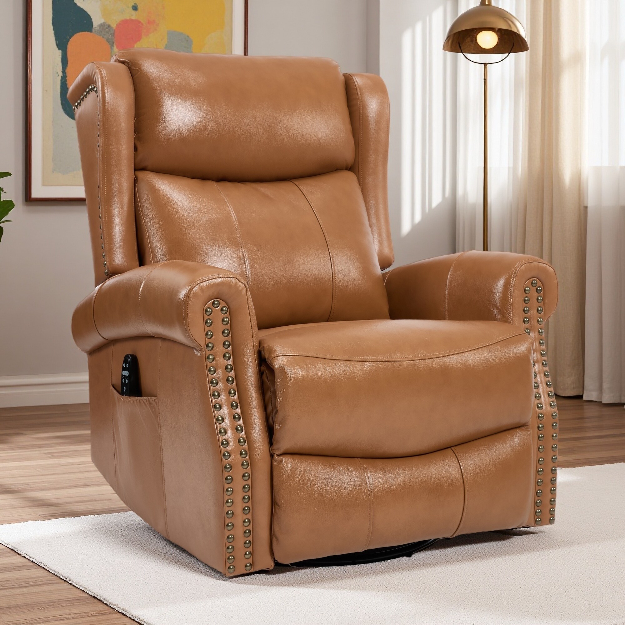Metal Genuine Leather Manual Recliner Chair with 360° Swivel Rocker and 8-Point Heat Massage