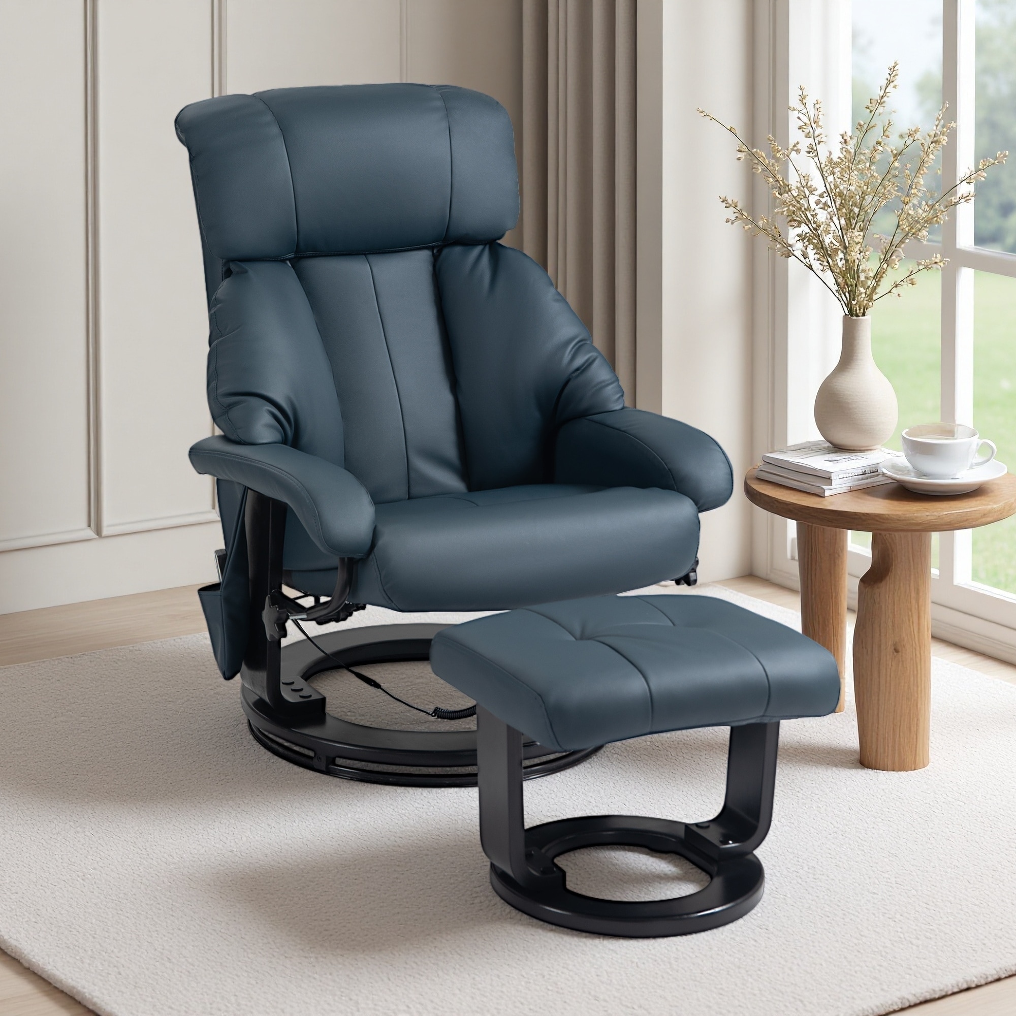 Blue Manual Recliner Chair in Faux Leather with Heavy Duty Motion Mechanism, 8 vibrating nodes and 3 massage modes.