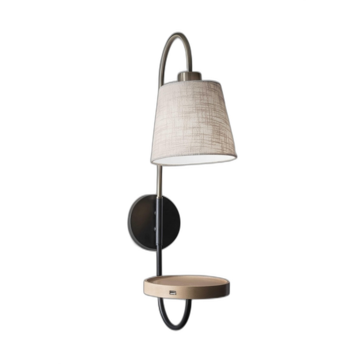 Antique Brass Metal Wall Lamp with Shelf USB Port and Off-White Shade - 13” x 7” x 25” (D x W x H)