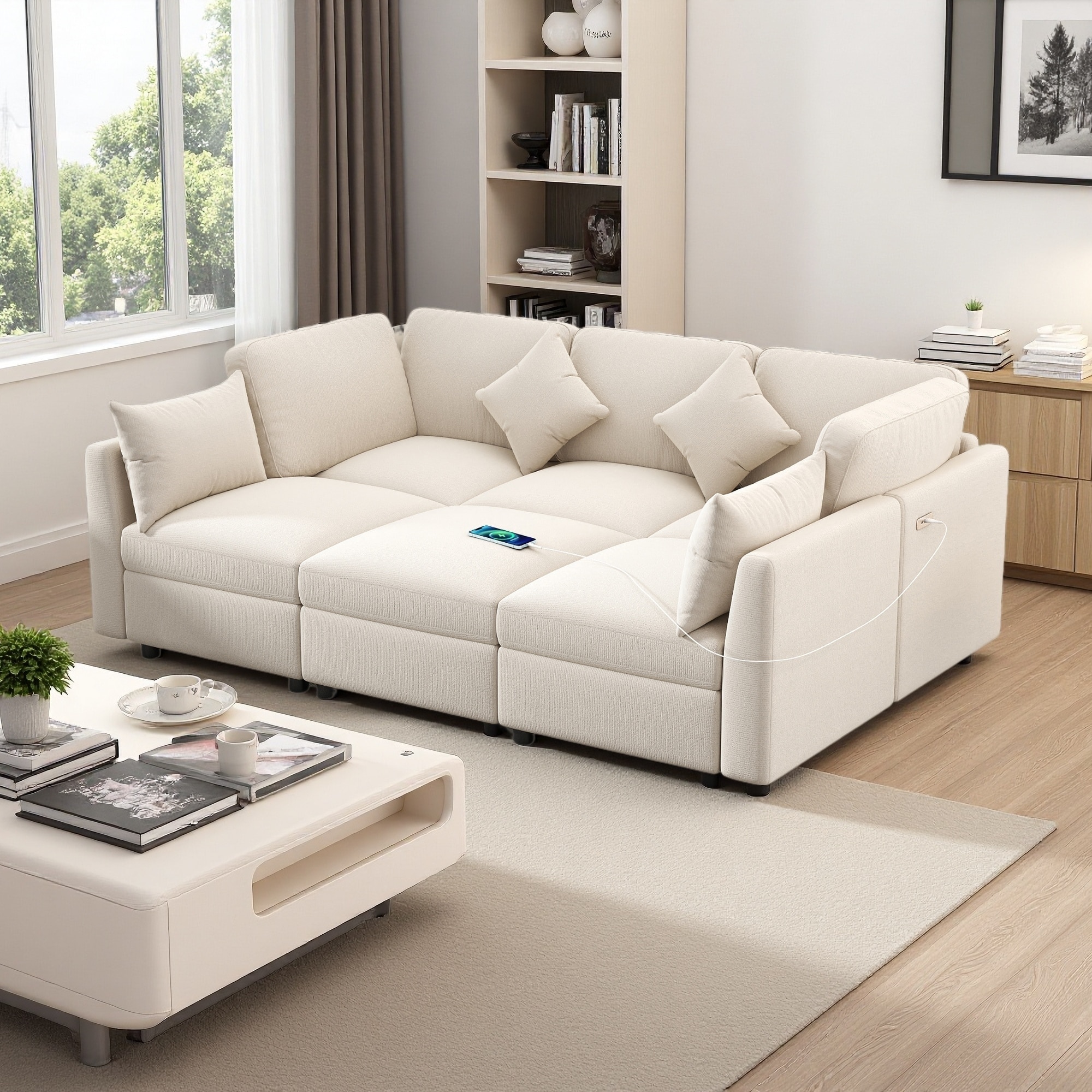 86.6" Chenille Modular 5-Seat Sectional Sofa with Movable Ottoman and USB Ports