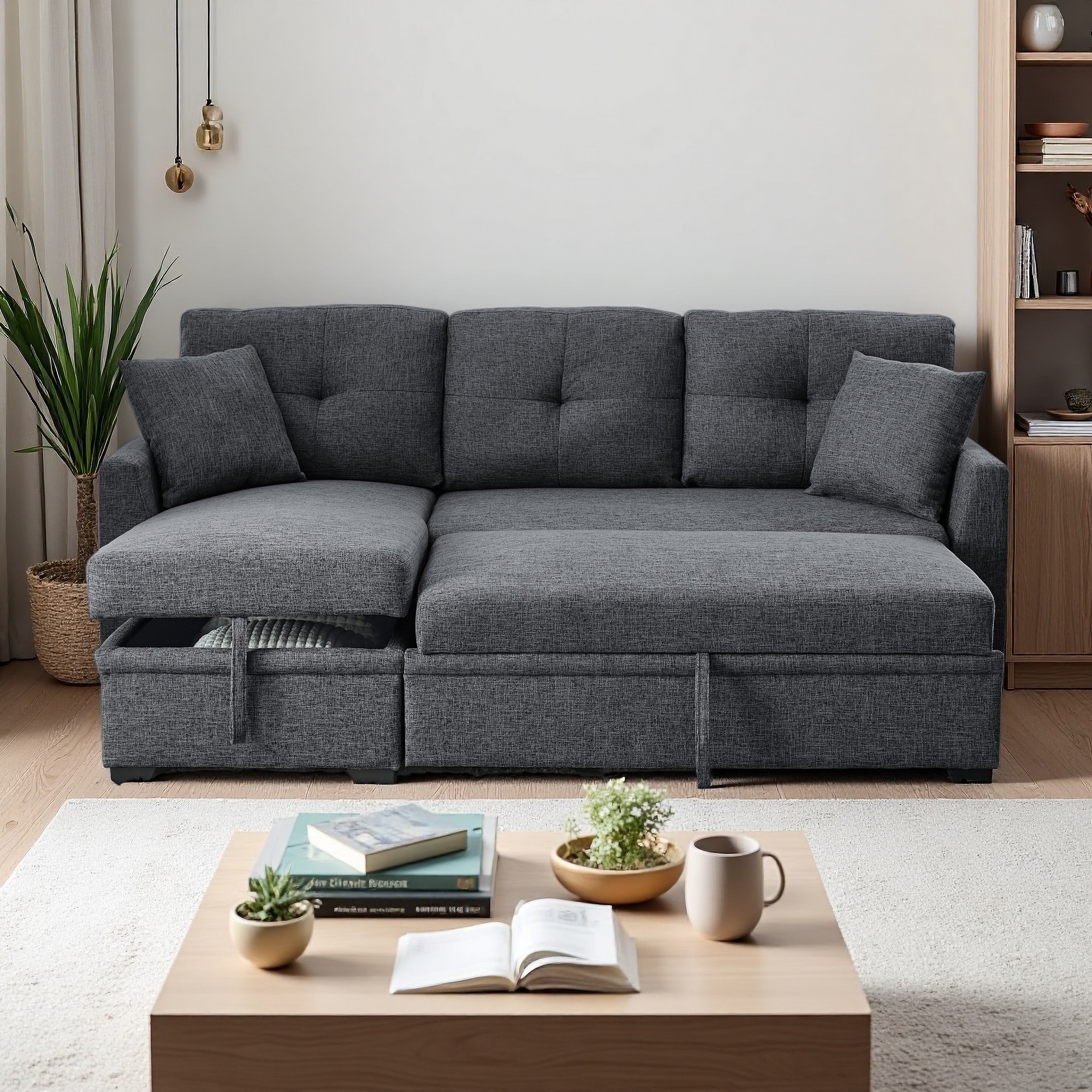 Roomfitters Sectional Sofa Pull-Out Bed Sleeper with Storage Ottoman, Three Pillows, and Built-In Charging Devices