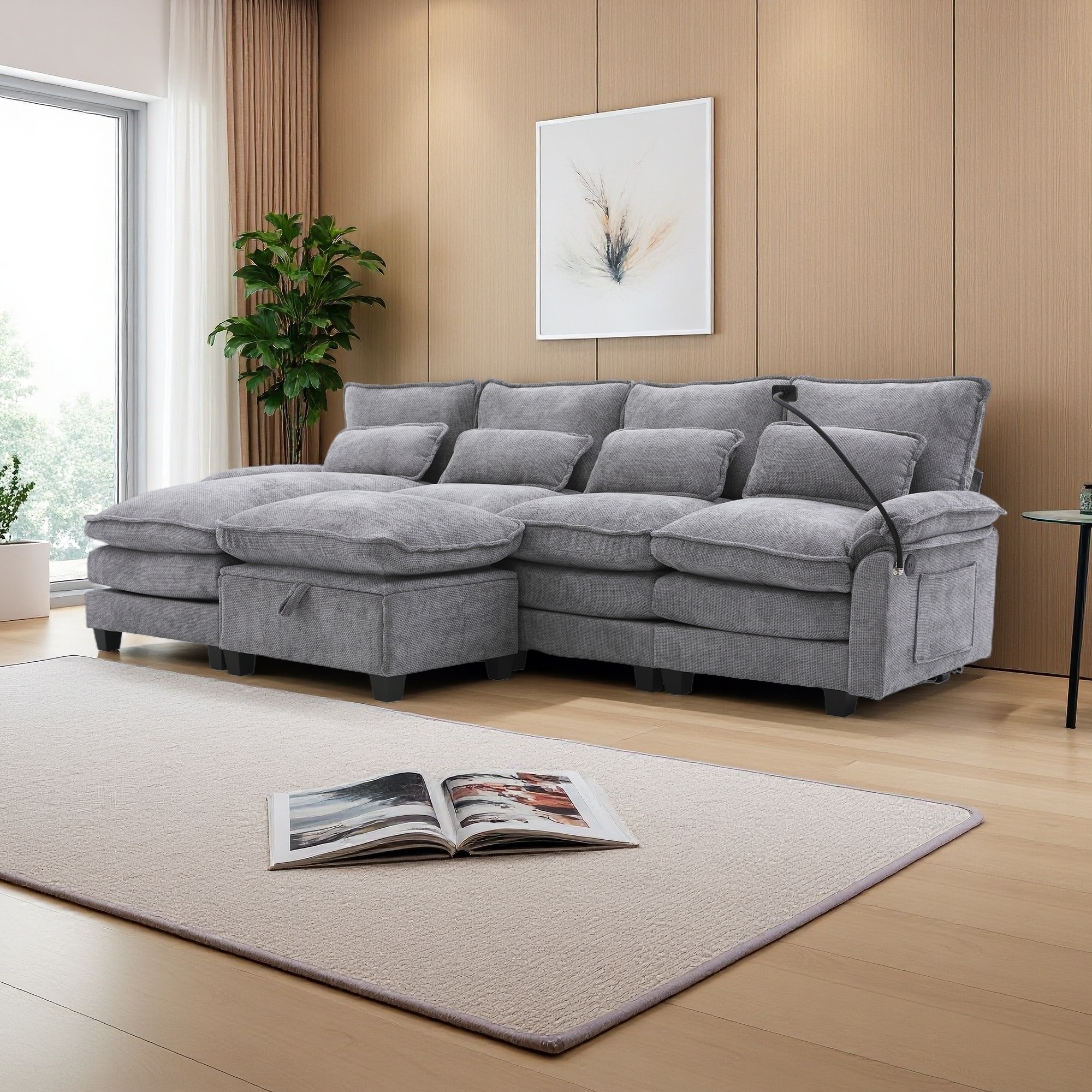 L-Shaped 4-Deep Seater Sectional Sofa Couch with 1 Movable Storage Ottoman & Pull out Drawers Under Each Seat