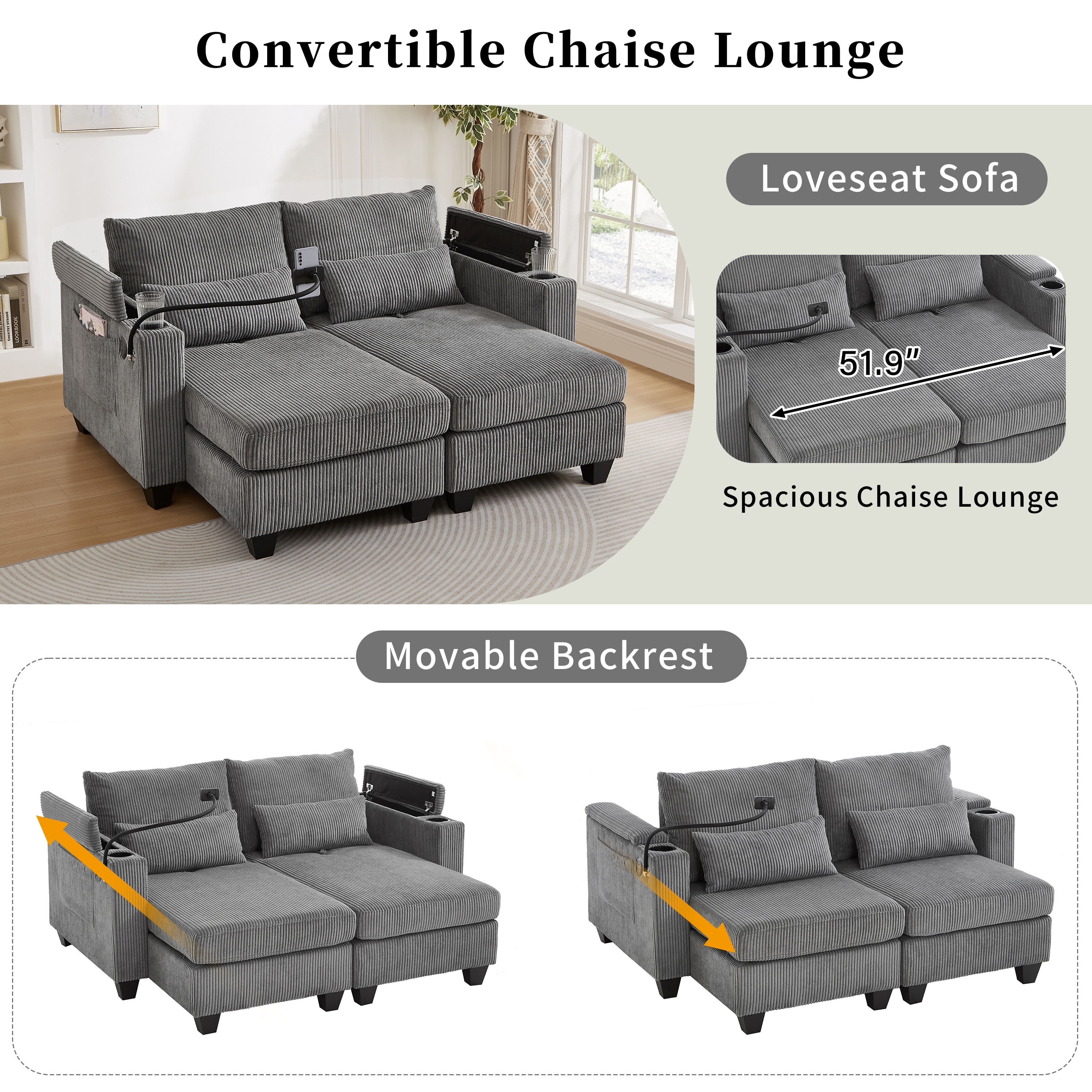 Corduroy U-shaped Sectional Sofa with Double Storage Chaise Lounge, Console Table with Charging Station, Box and Cup Holders