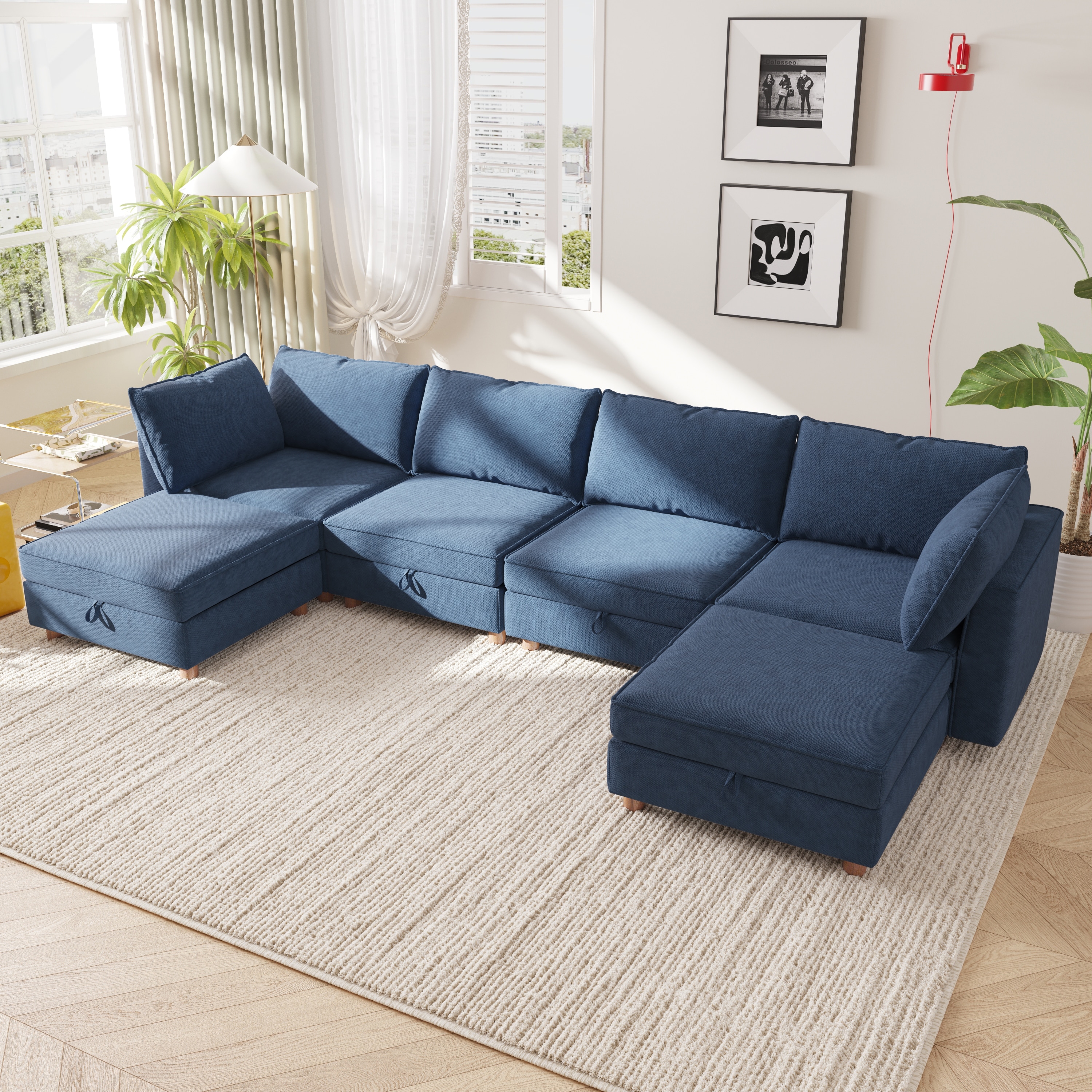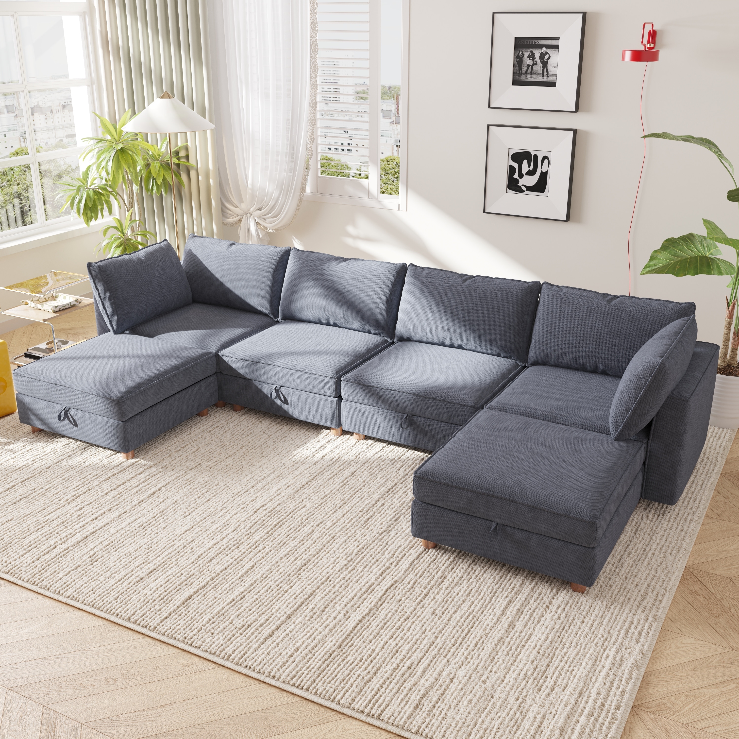 GDFStudio - Chenille Fabric 6-Seat 128" Modular Sectional Sofa with Storage & Solid Wood Frame for Living Room