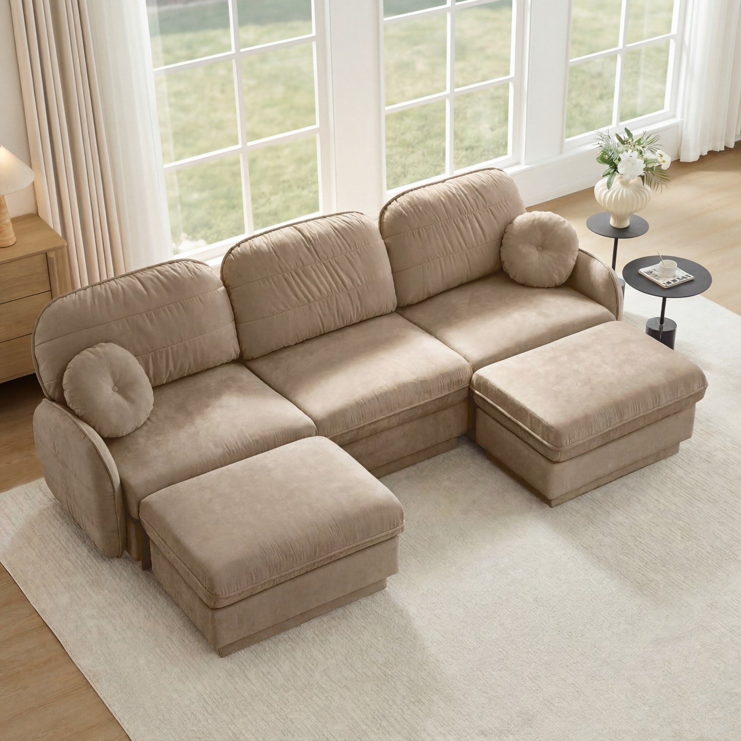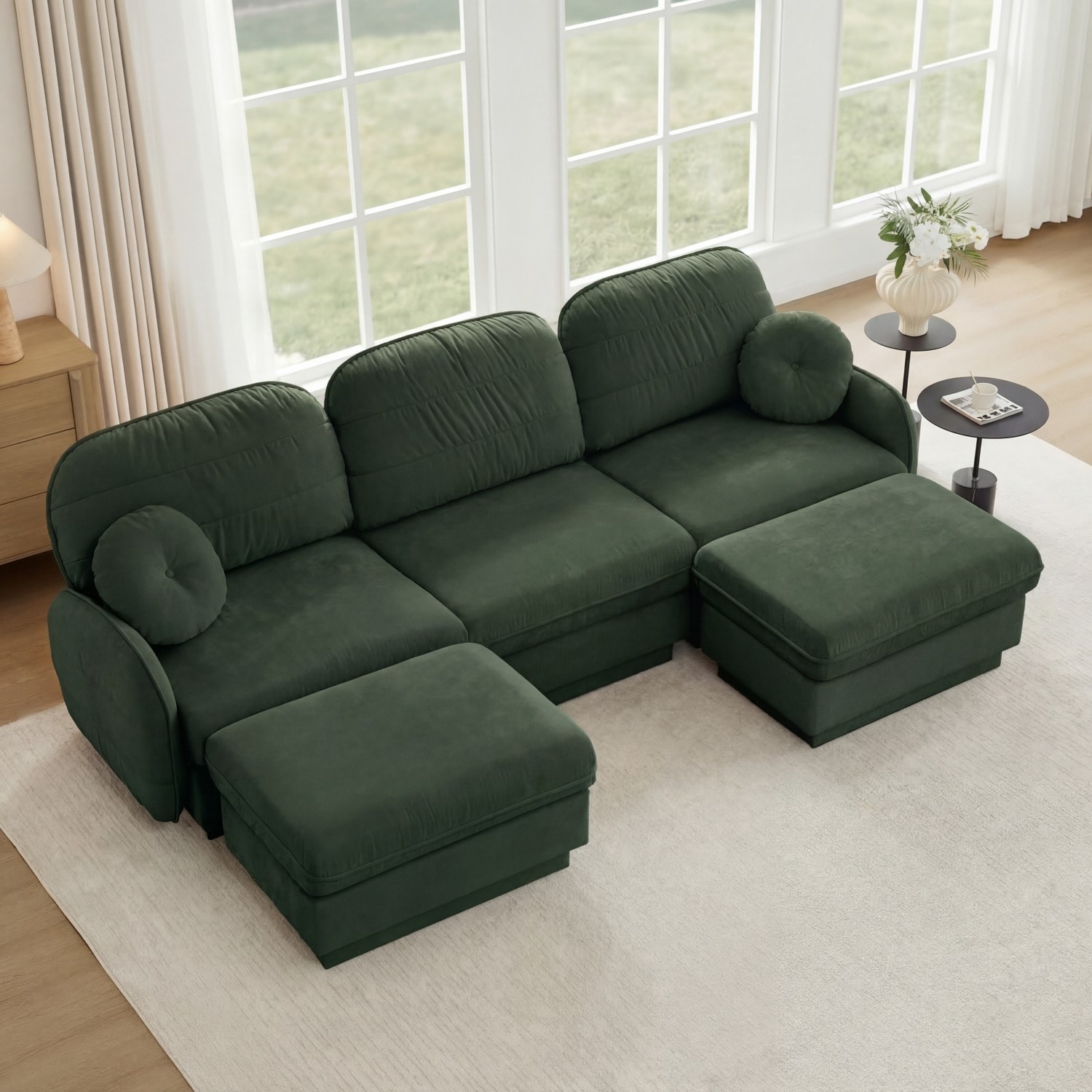 105" Chenille Sectional Sofa with 2 Round Pillows and 2 Movable Ottomans