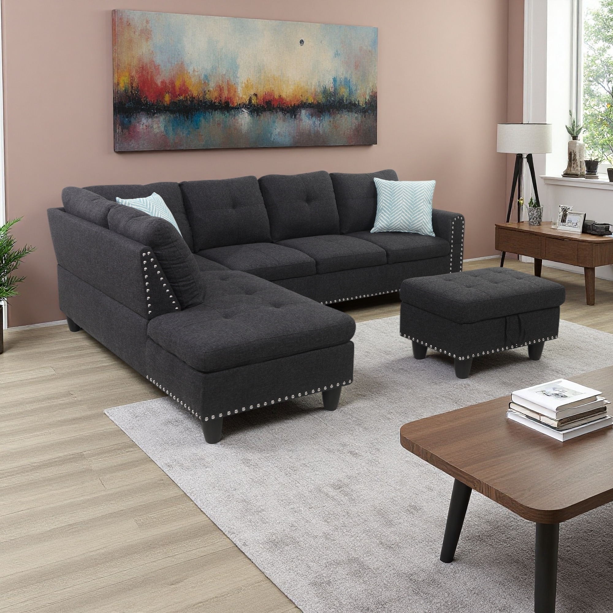 98" Linen L-Shaped 3-Seat Sectional Sofa with Ottoman and Storage