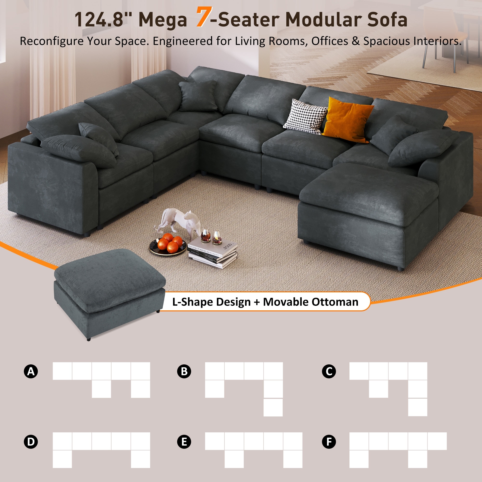 Oversized Modular Sectional Sofa, 7 Seater Corner Sofa, L-Shape Sofa Set with Movable Ottoman, Plush Chenille Fabric Large Sofa