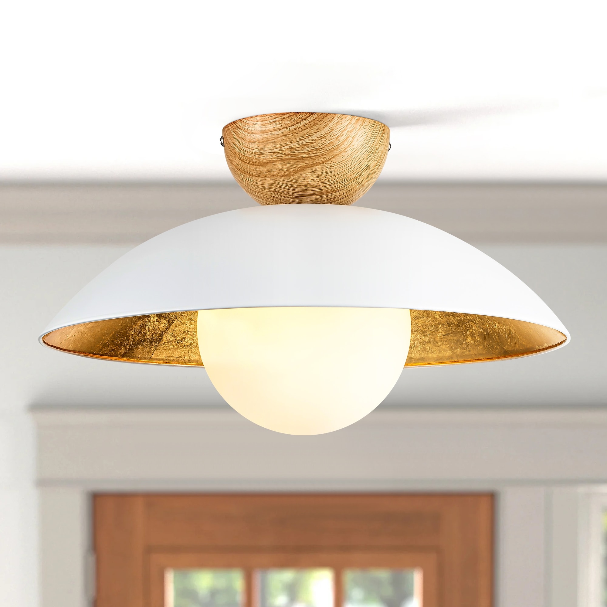 14.5 in. 1-Light Black/White Finish Wood Gold Leaf Dome Semi-Flush Mount Light with Opal Glass Globe