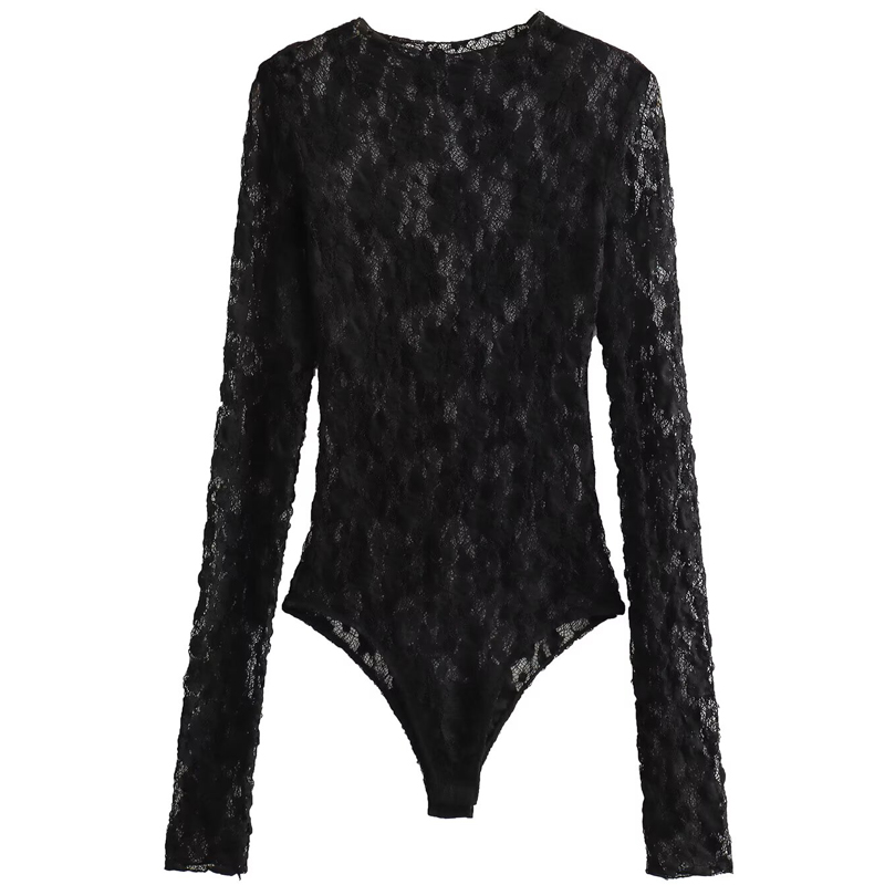 Sexy Black Lace Bodysuit For Women, Chic Hollow Out Design, Long Sleeves, High Spandex Lingerie black l