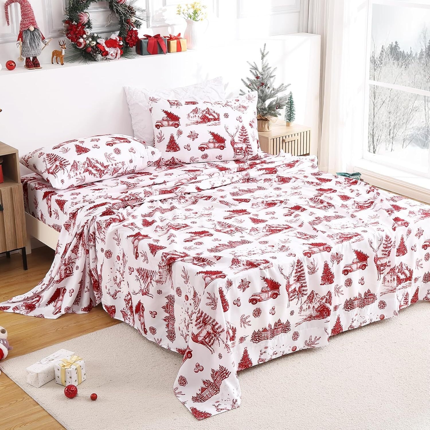 Christmas Red Boho Holiday Bed Sheets Set with 16 Inches Deep Pocket