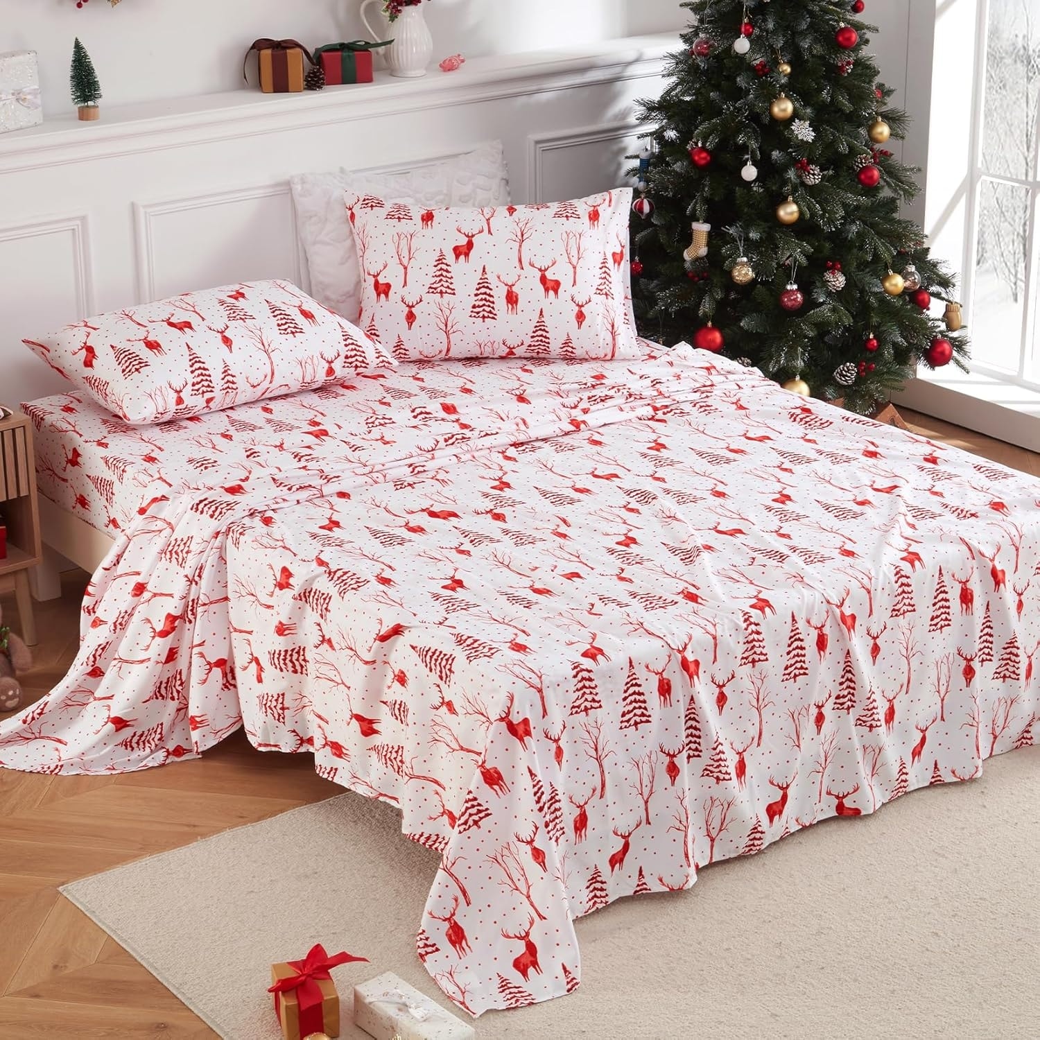 Christmas Bed Sheets Soft Brushed Microfiber Bed Sheet 16 Inches Deep Pocket Winter Holiday Sheets Set, Red Printed