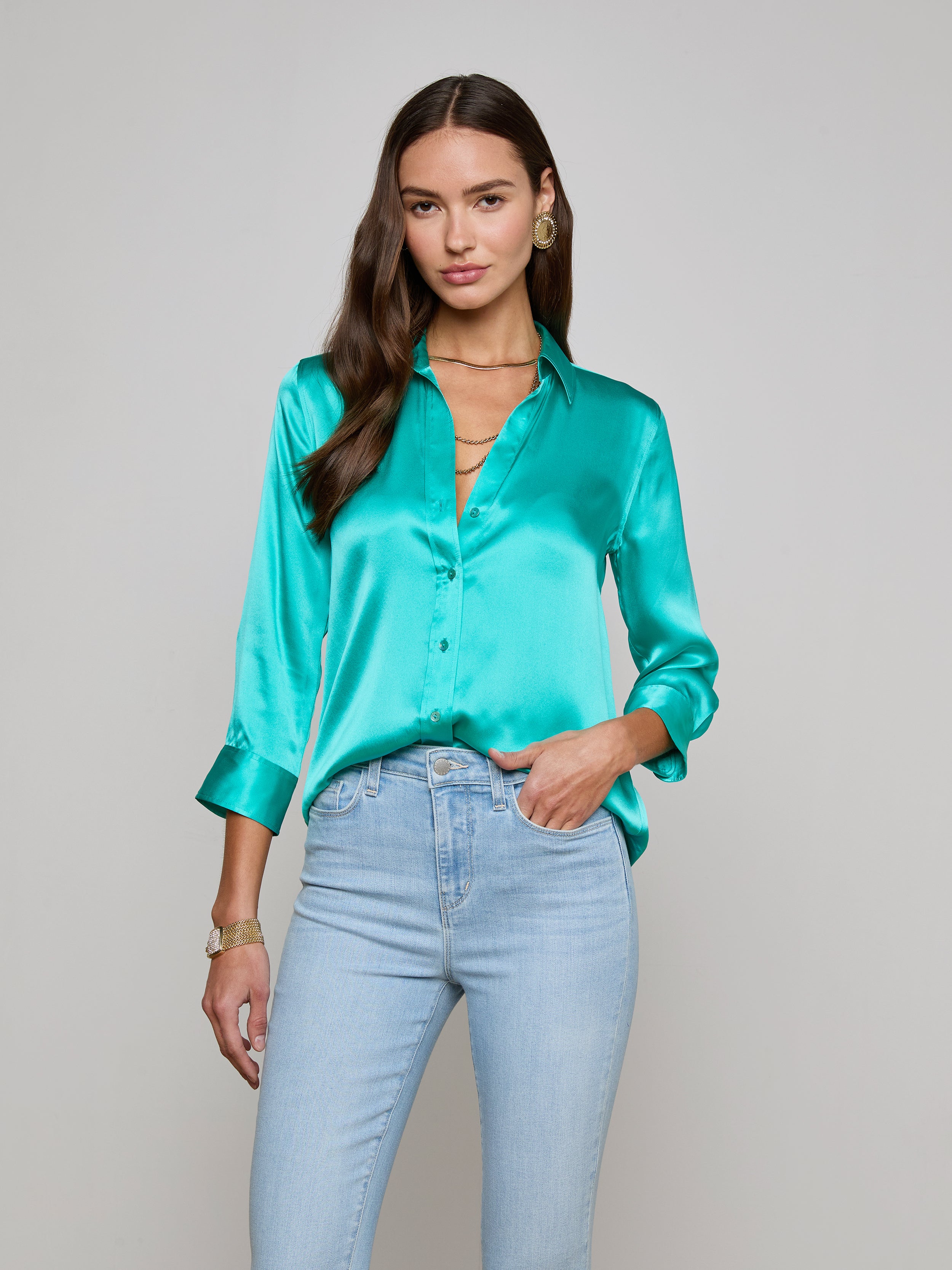 L'AGENCE Dani Silk Blouse Top In Pool Blue