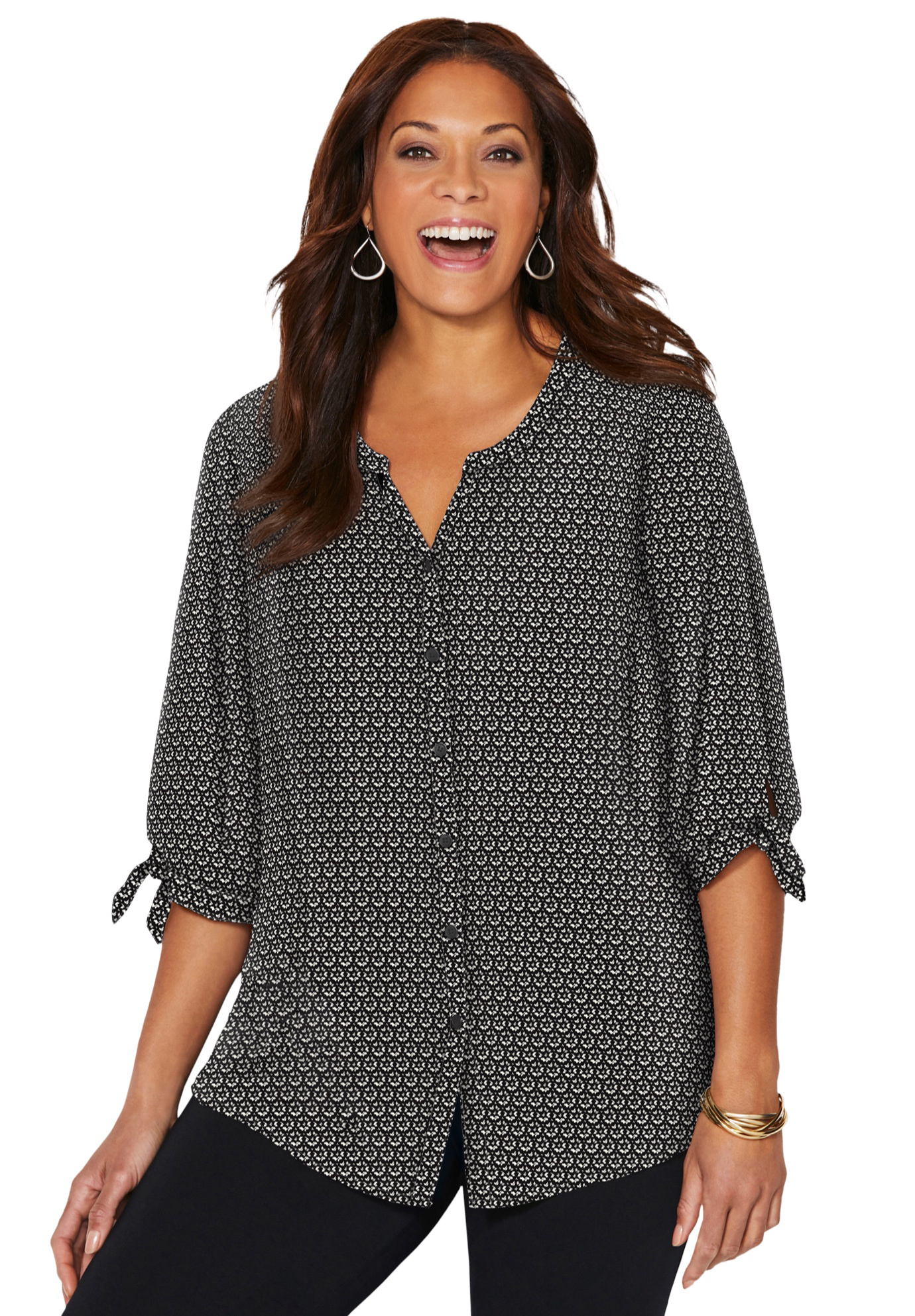 Plus Size Women's Georgette Buttonfront Tie Sleeve Cafe Blouse by Catherines in Black White Tile Print (Size 3X)