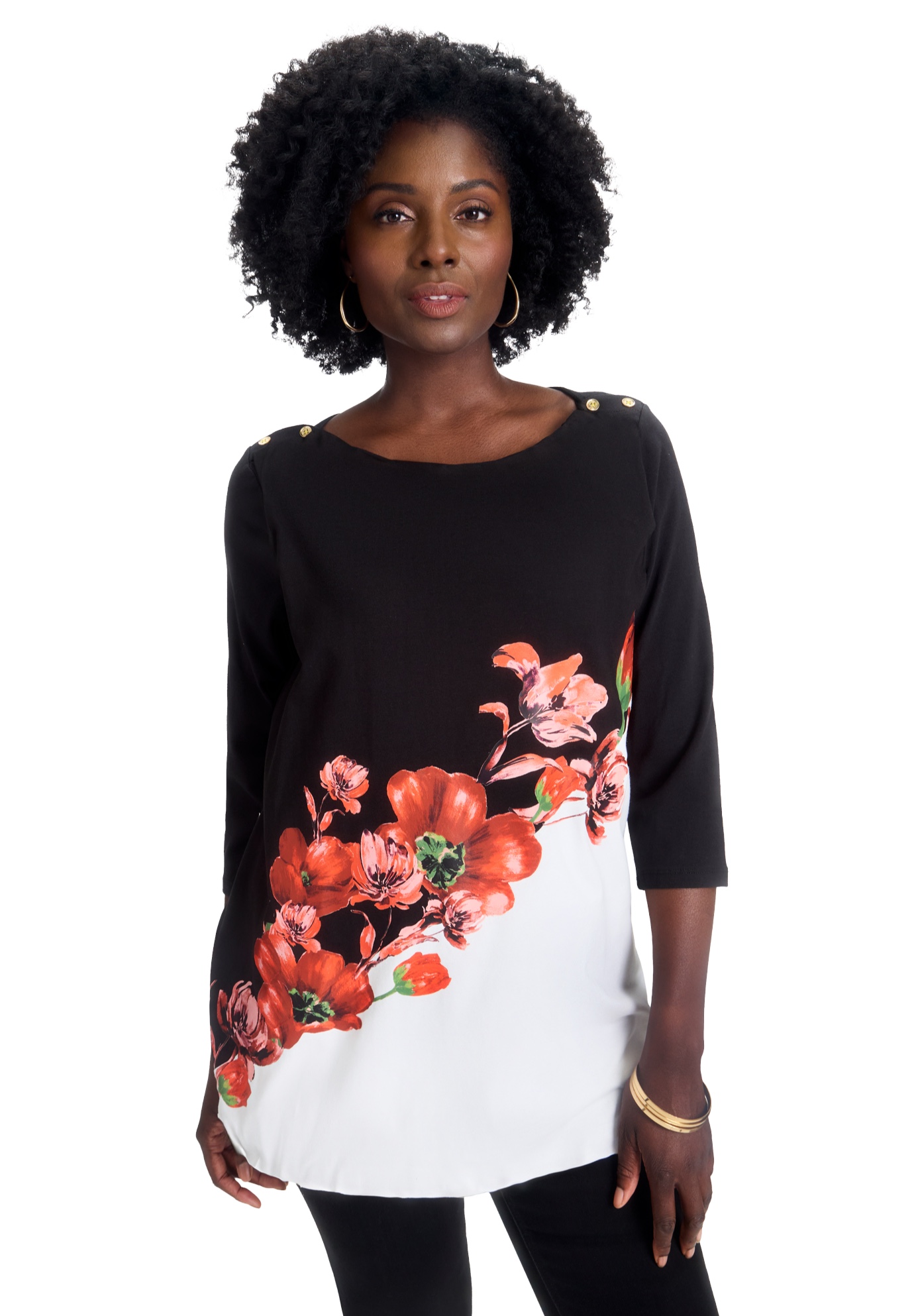 Plus Size Women's Stretch Cotton Boatneck Tunic by Jessica London in Red Tulip Placement (Size 42/44) Long Knit 3/4 Sleeve Shirt