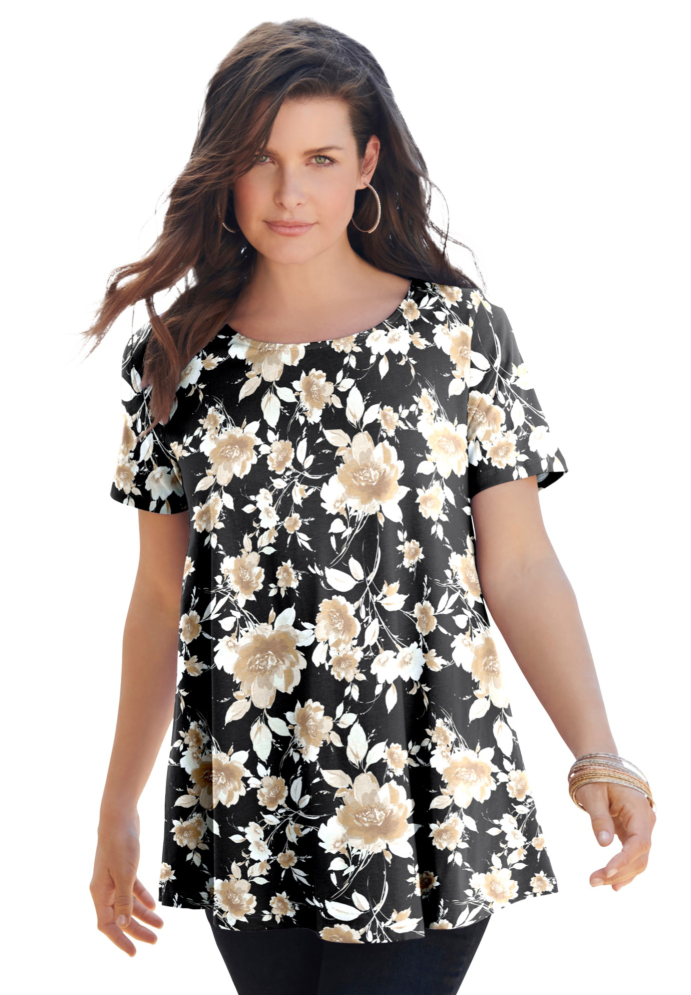 Plus Size Women's Plus Size Cotton Ultimate Swing Tee with Keyhole Back by Roaman's in Camel Watercolor Rose (Size S) Short Sleeve T-Shirt